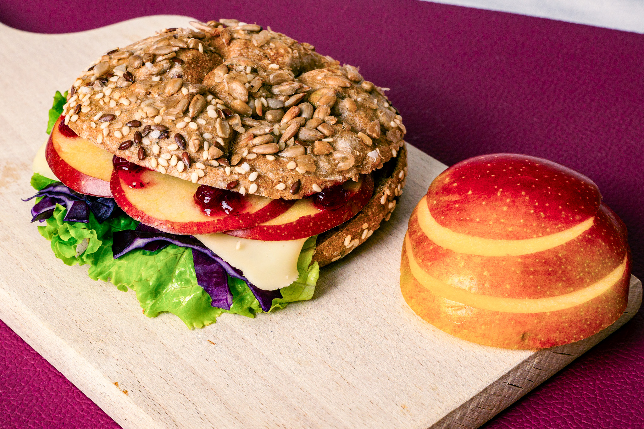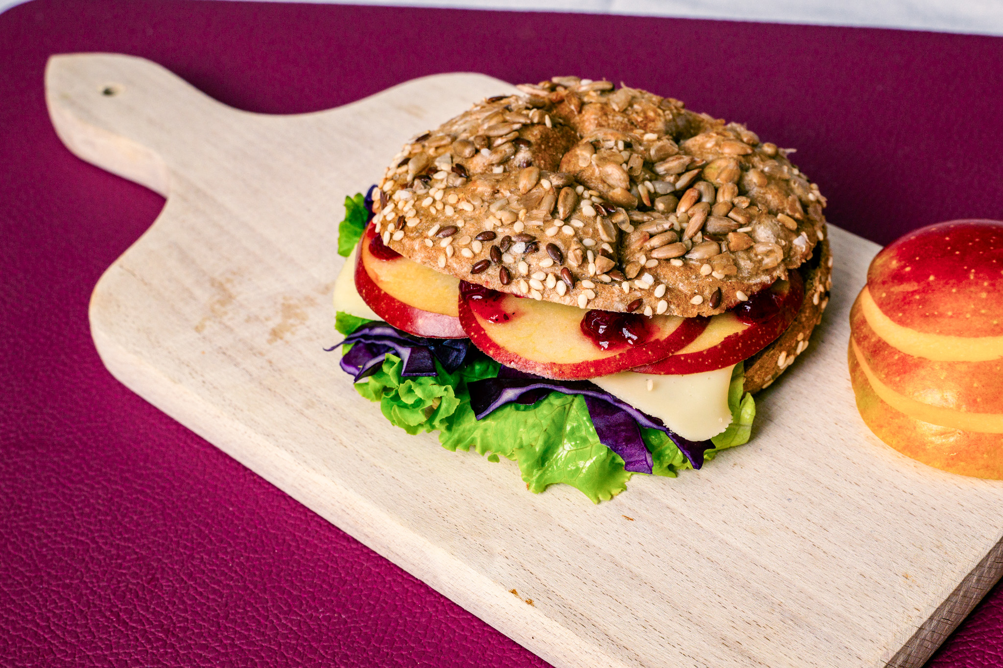 Den Apfel in dünne Scheiben schneiden und mit etwas Zitronensaft beträufeln. Das halbierte Gebäck mit dem Salat, den Apfelscheiben, dem Rotkraut und dem Käse belegen.