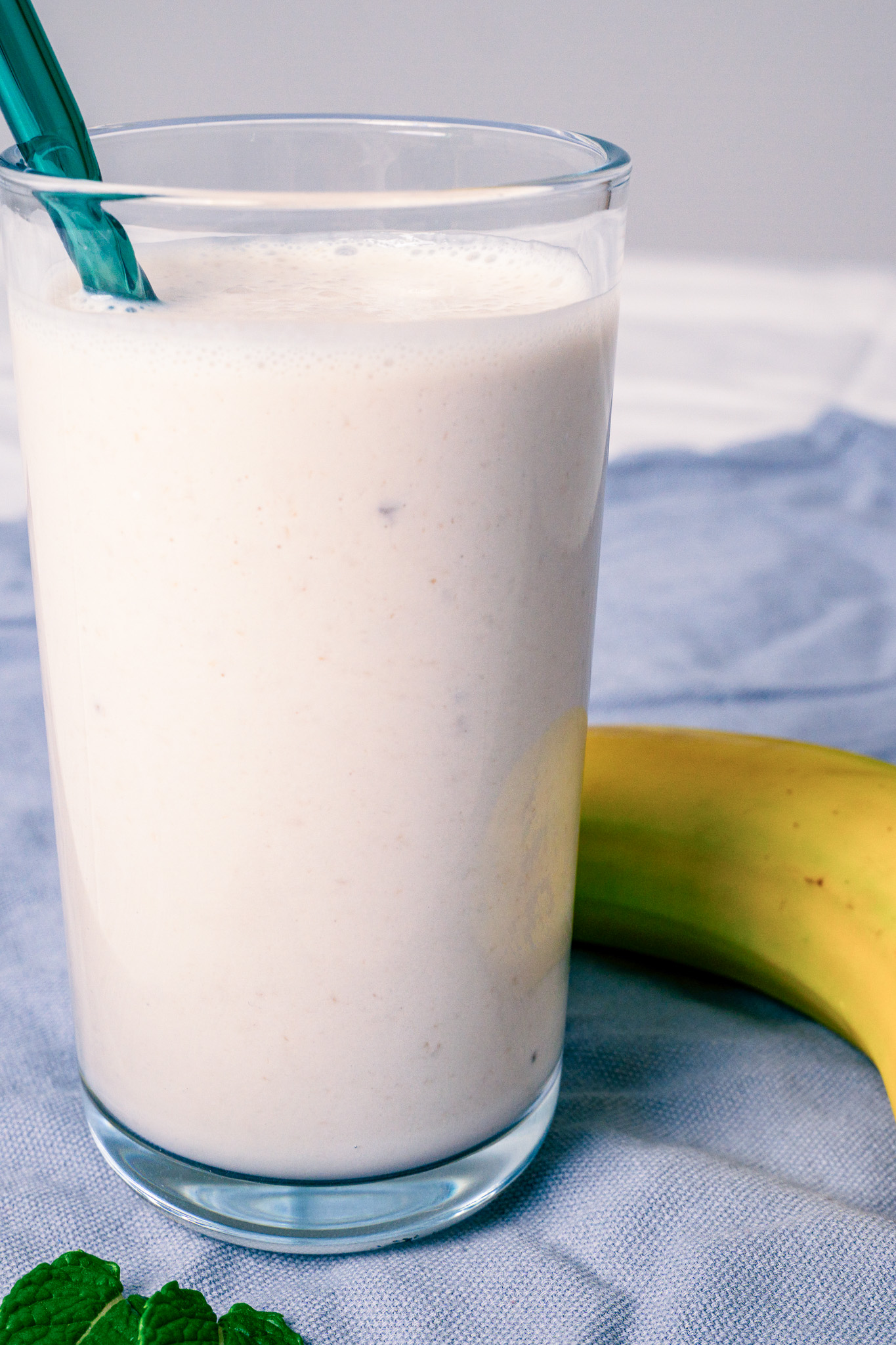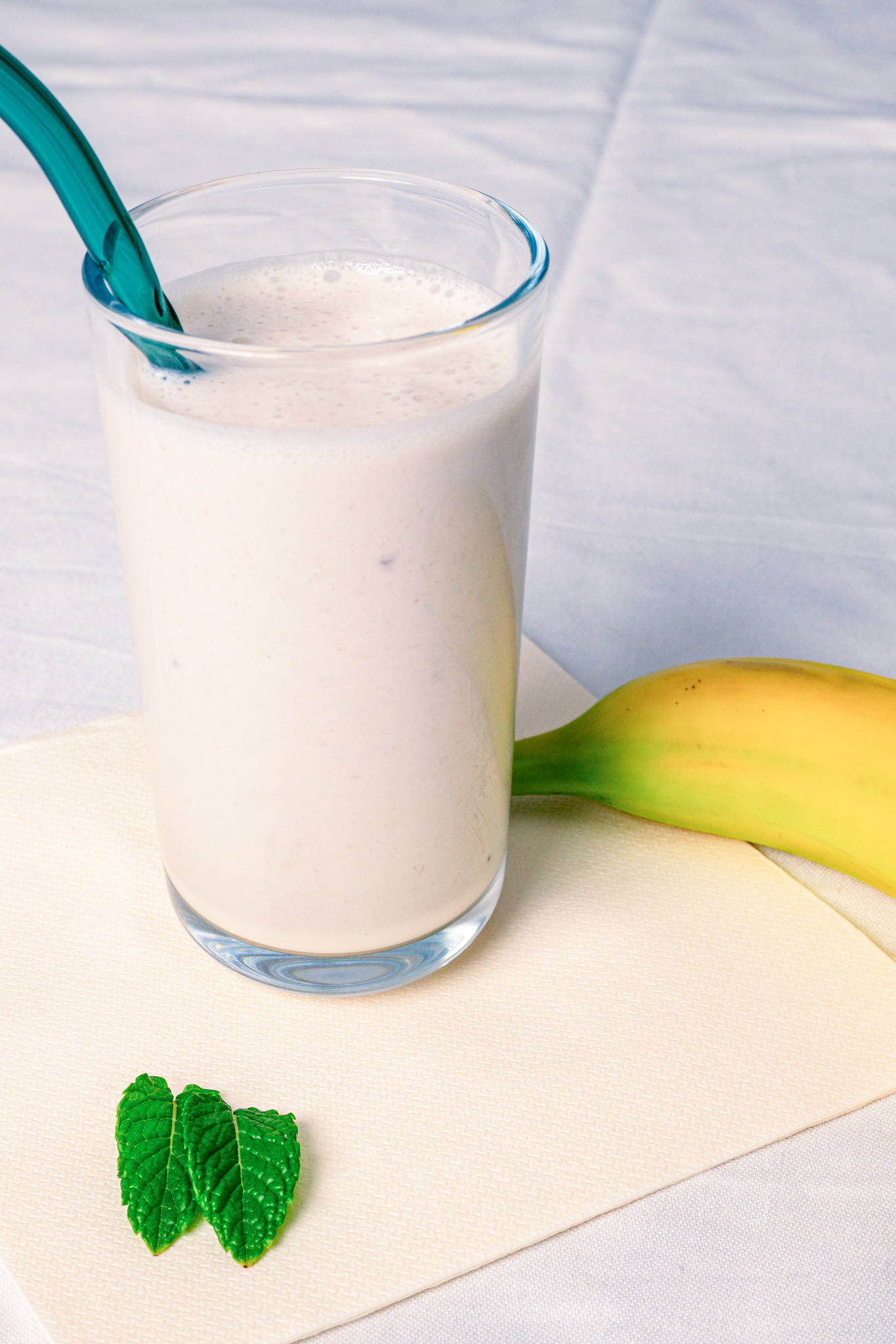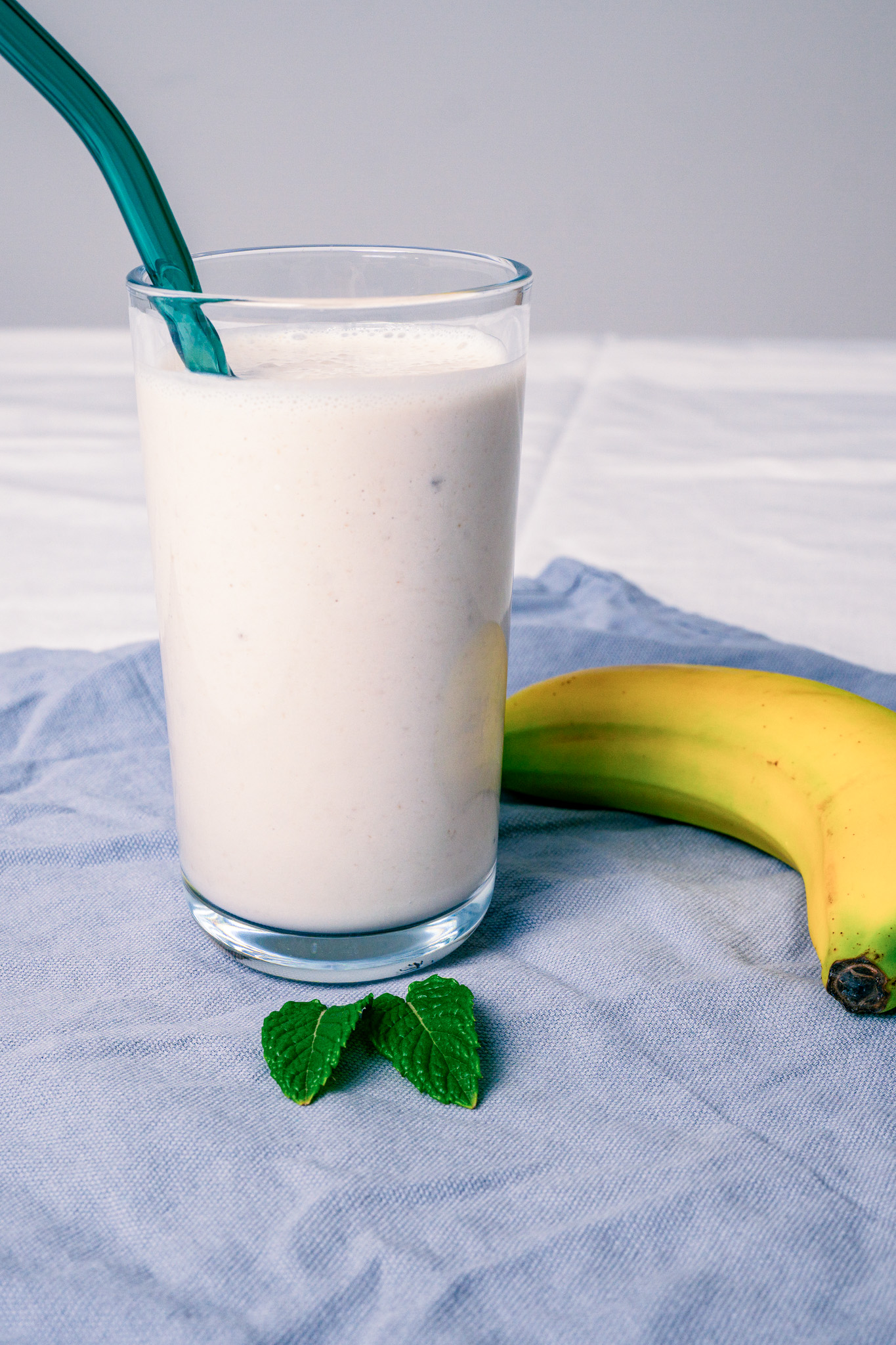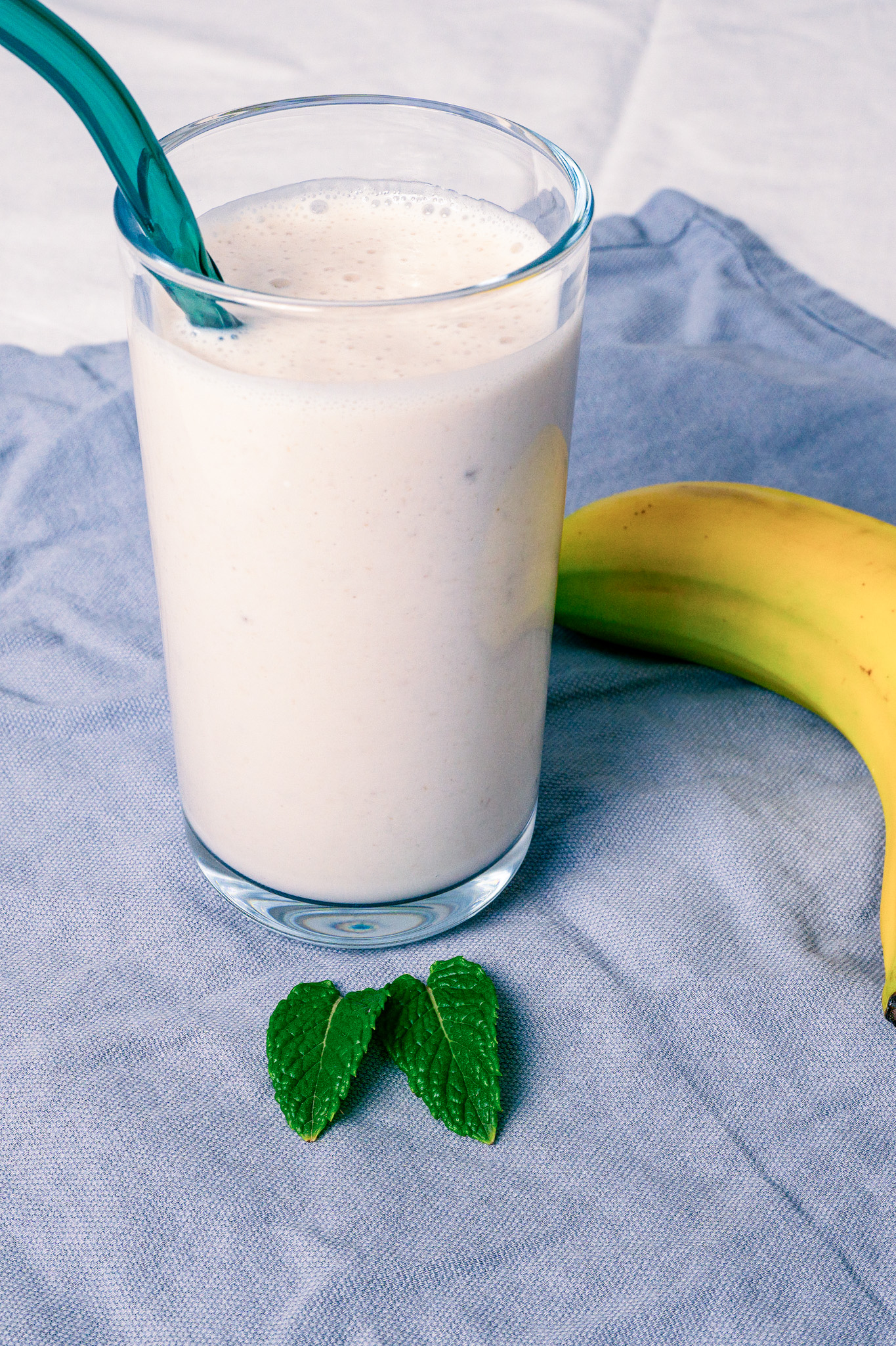 Bananen klein schneiden. Pflanzliche Alternative zu Joghurt, Pflanzendrink und Wasser mit den Bananenstücken im Mixer fein pürieren.