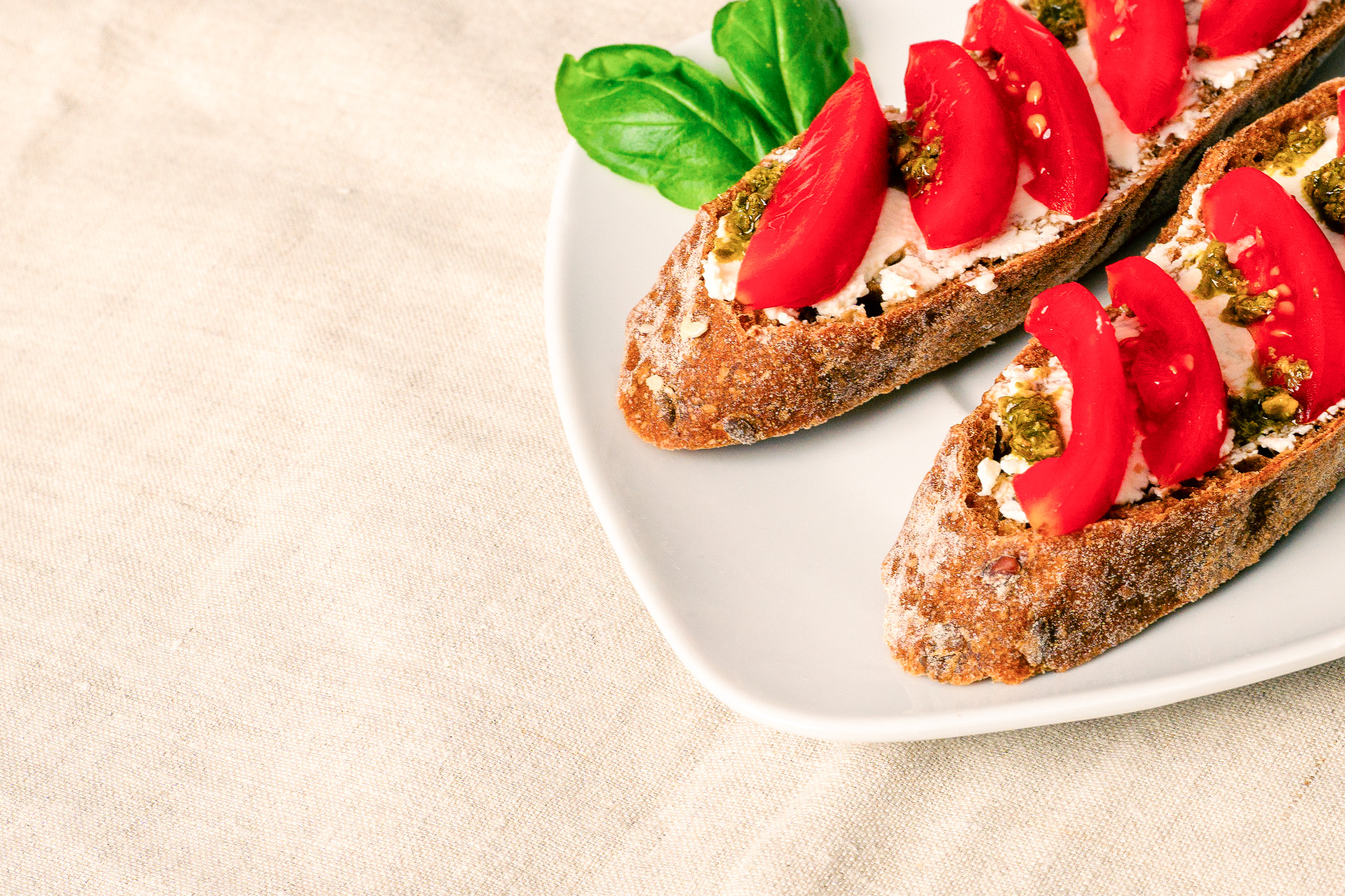 Das Brot mit Frischkäse bestreichen, mit den Tomatenvierteln belegen und mit Pesto garnieren.
