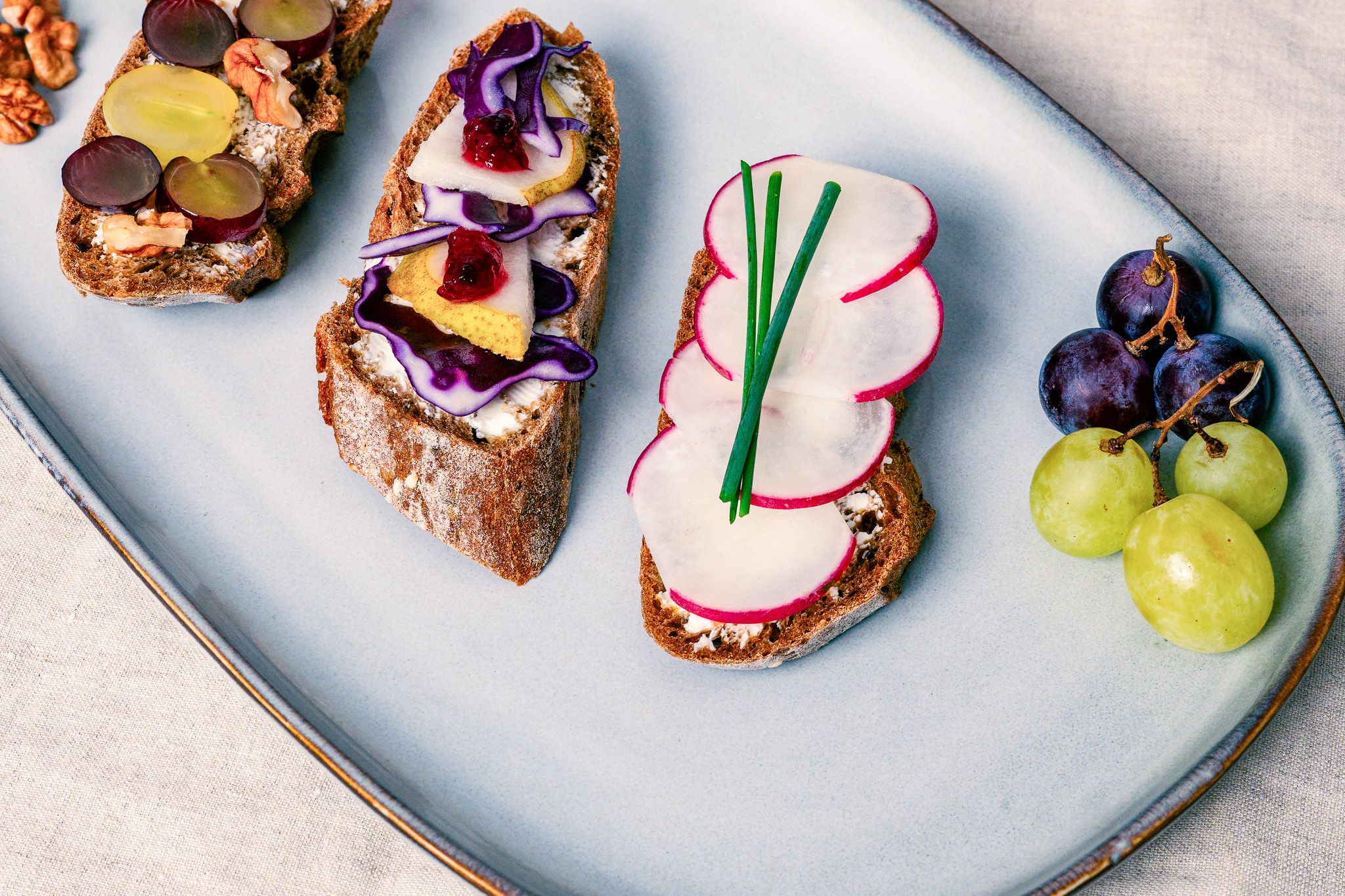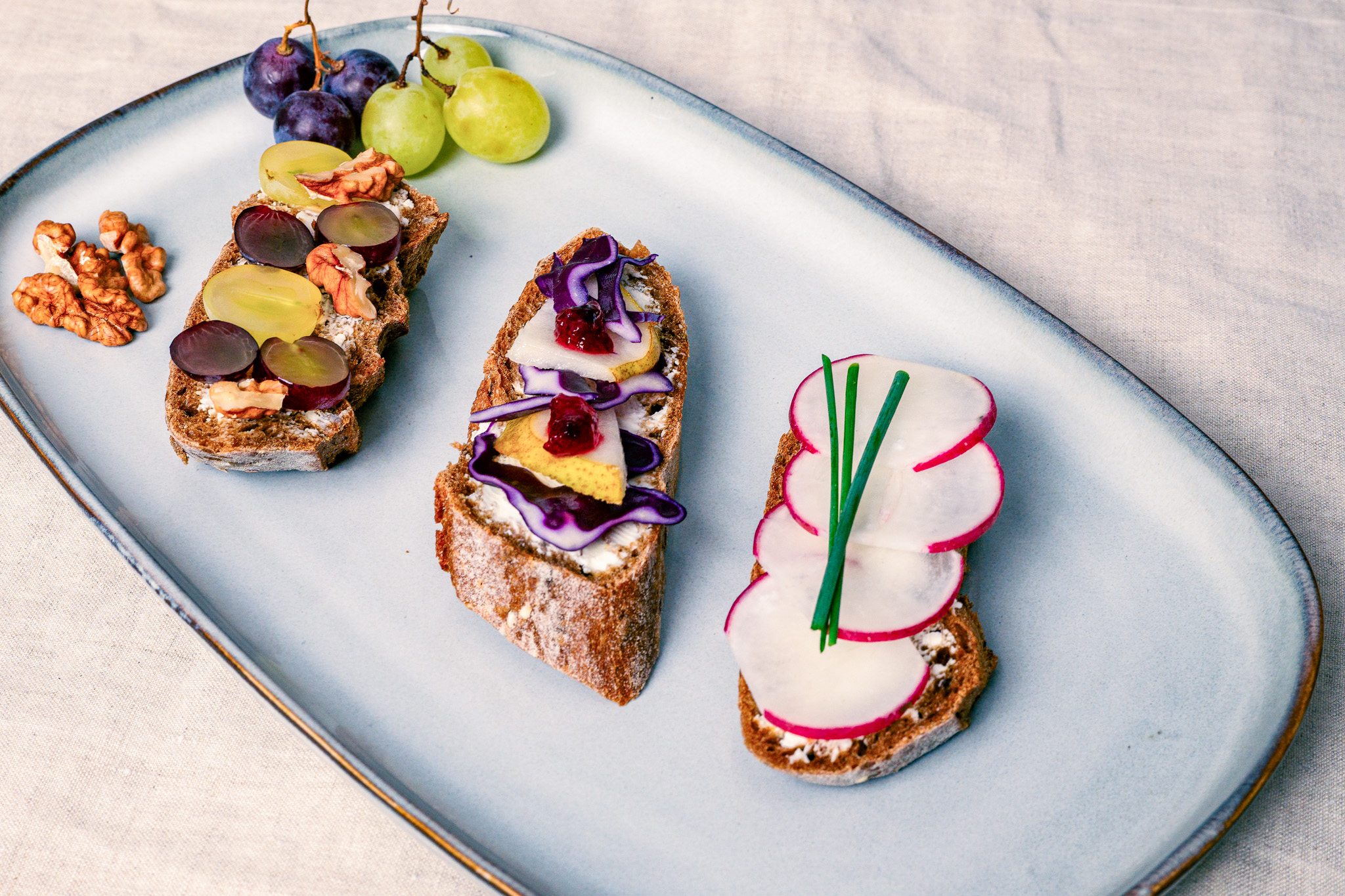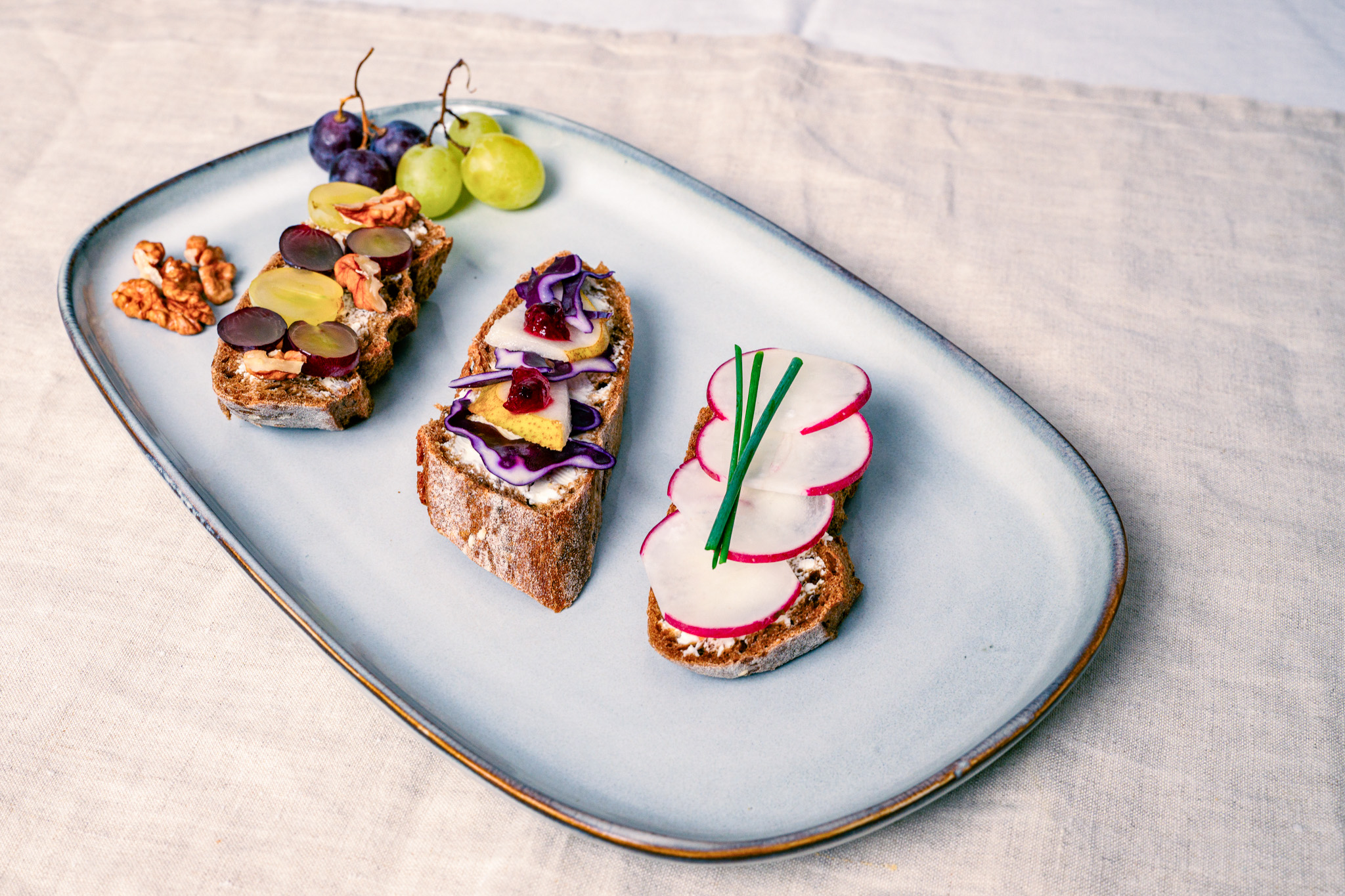 Das Brot mit Frischkäse bestreichen und mit Rotkraut und Birnenscheiben belegen. Mit etwas Preiselbeermarmelade garnieren.
