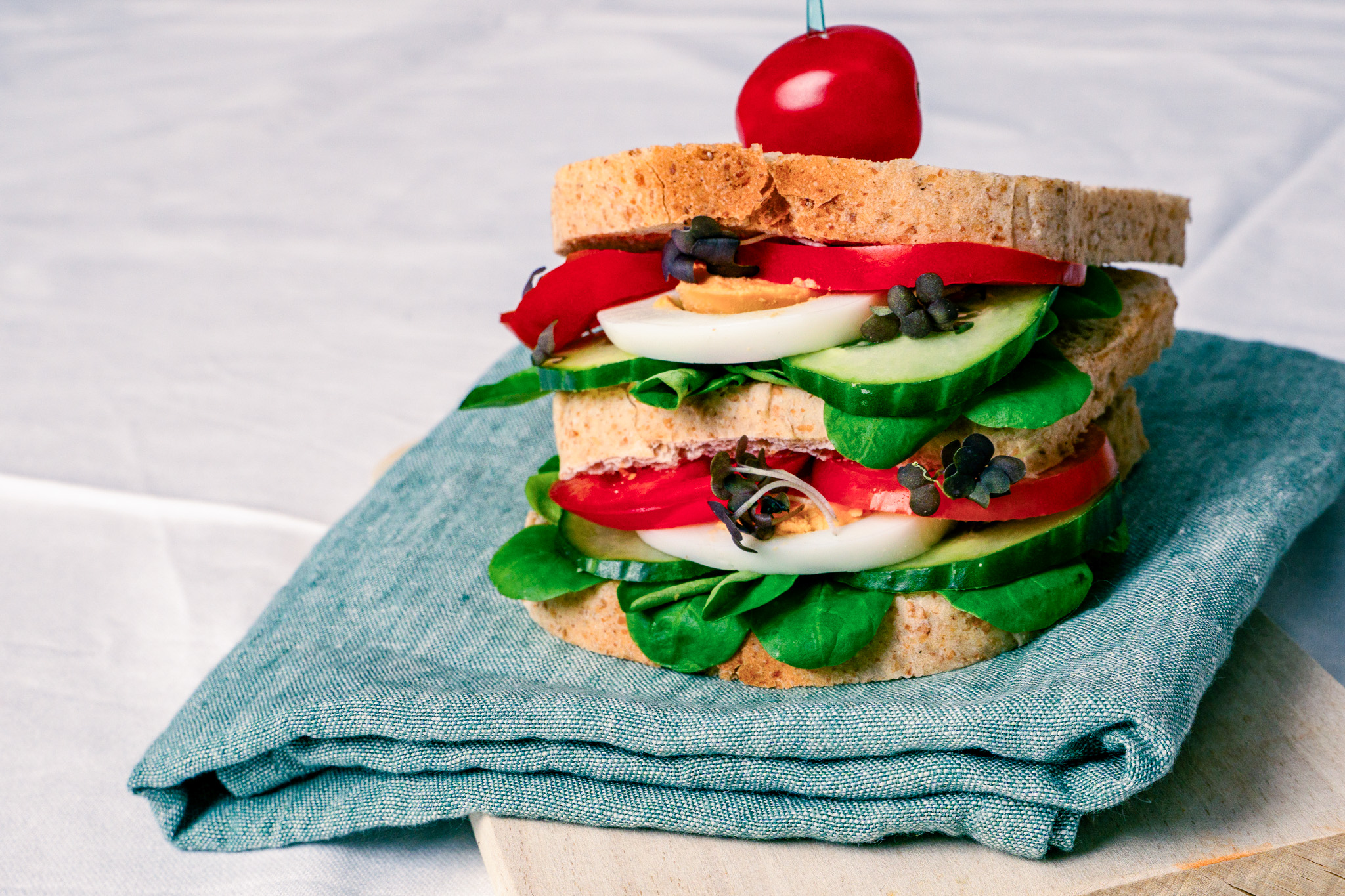 2 Toastbrotscheiben dünn mit Senf bestreichen und die Zutaten (Salat, Gurken- und Tomatenscheiben, Ei sowie Kresse und Basilikumblätter) darauf verteilen.