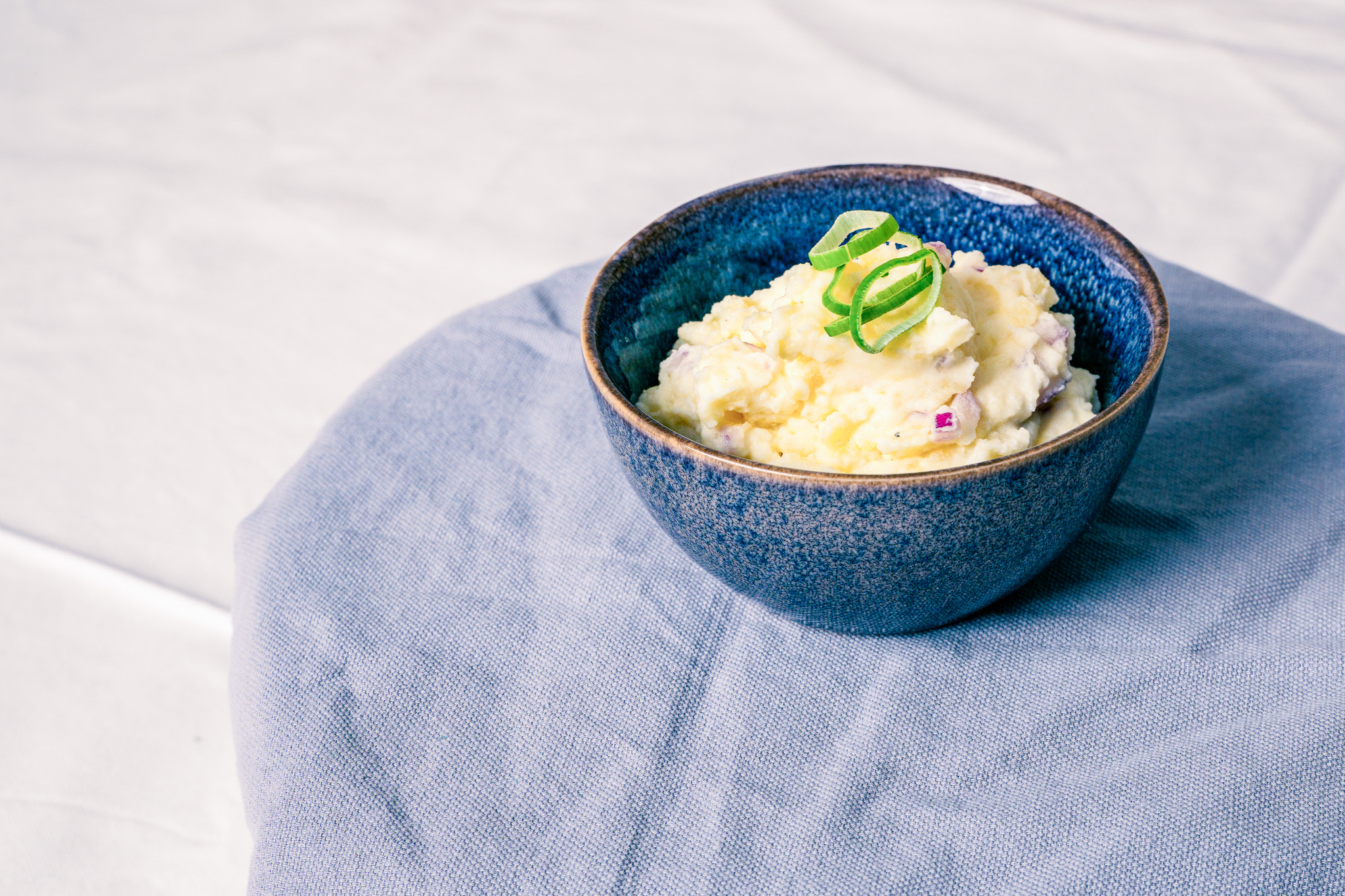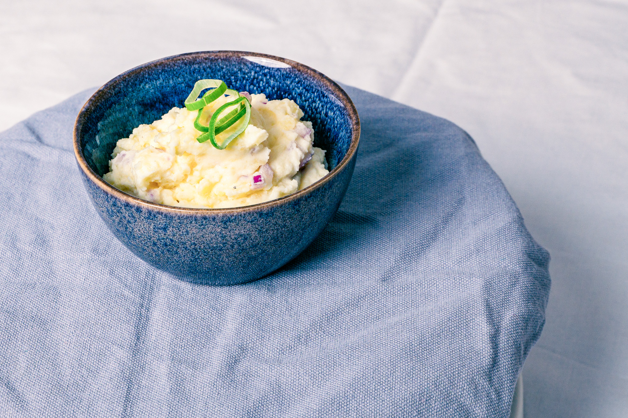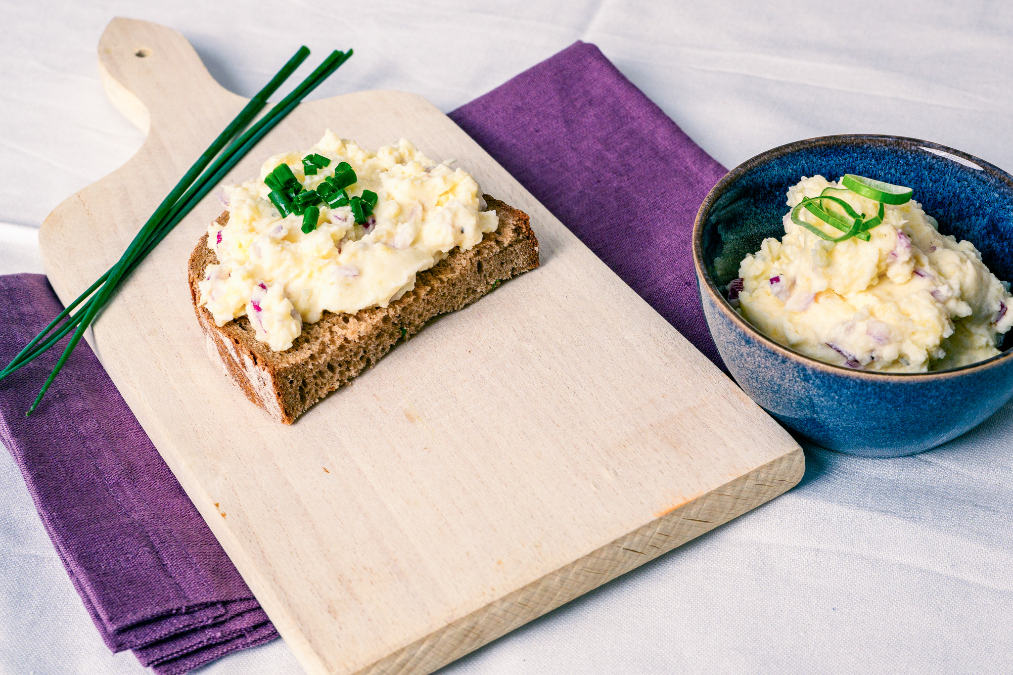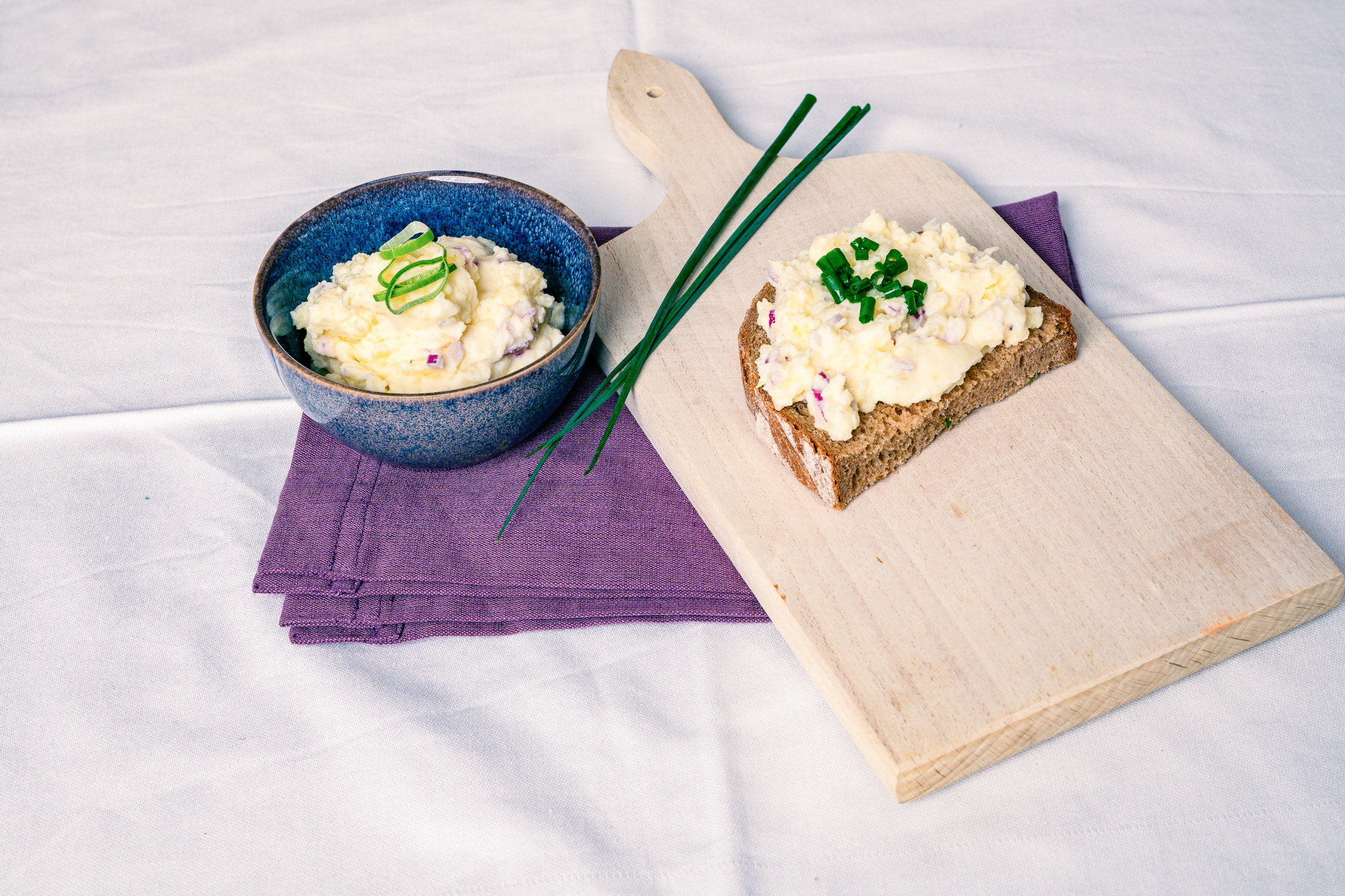 Die gekochten Erdäpfel schälen und zerdrücken/stampfen. Naturjoghurt und Sauerrahm dazu geben und verrühren, mit Zwiebel und Knoblauch sowie Gewürzen abschmecken. Mit fein geschnittenem Schnittlauch auf Vollkornbrot servieren.