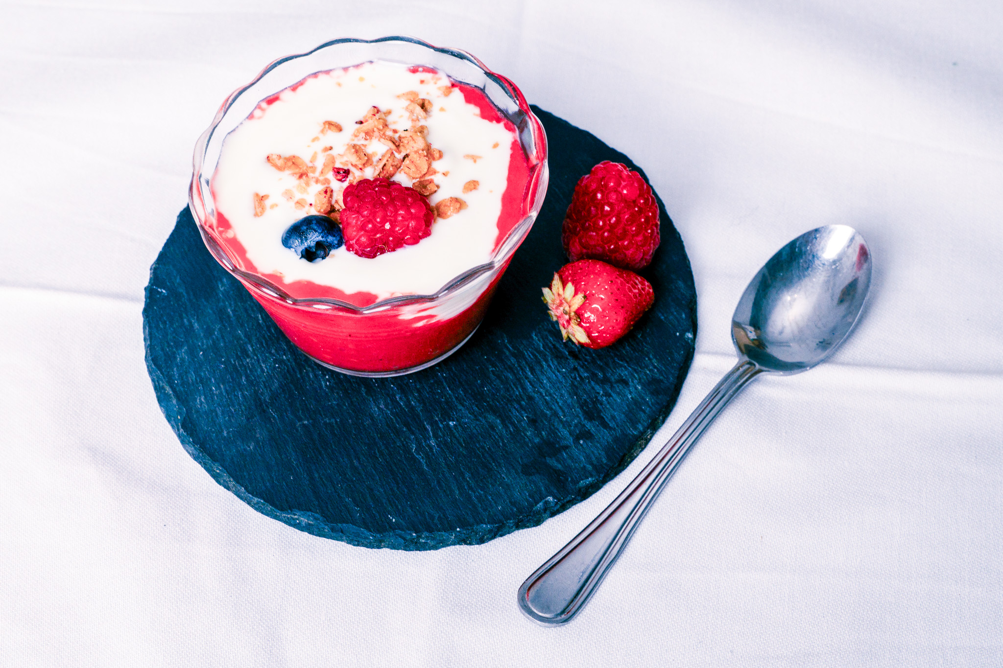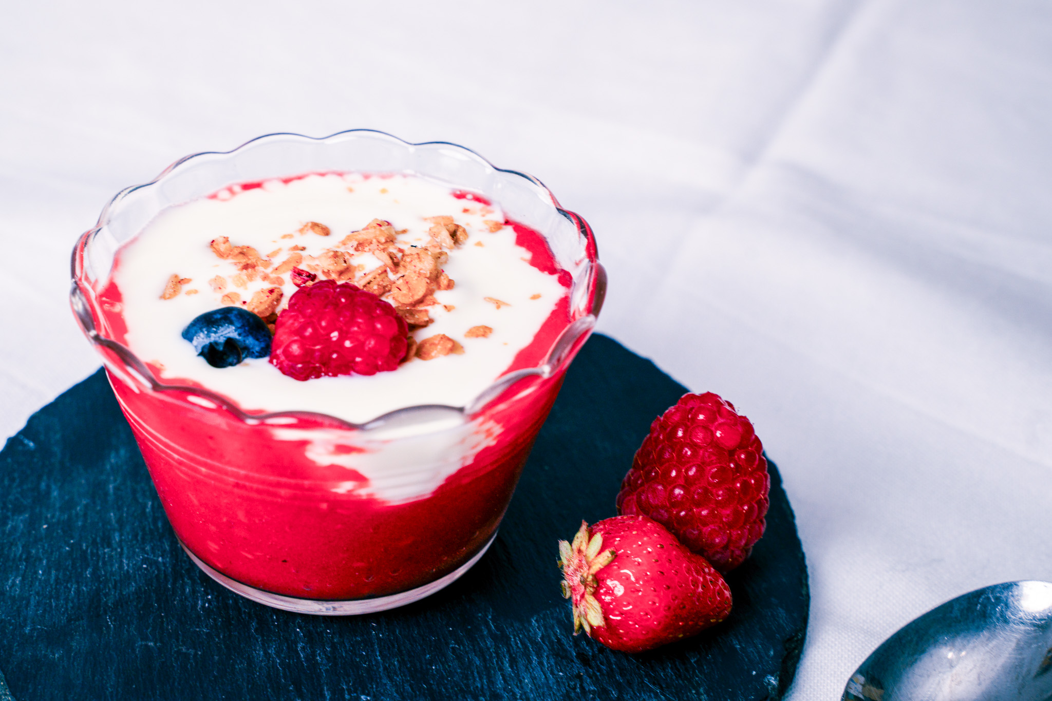 Topfen, Naturjoghurt, Staubzucker und Vanillezucker mit dem Handmixer vermengen. Einen Teil Obst unterheben, den Rest pürieren.