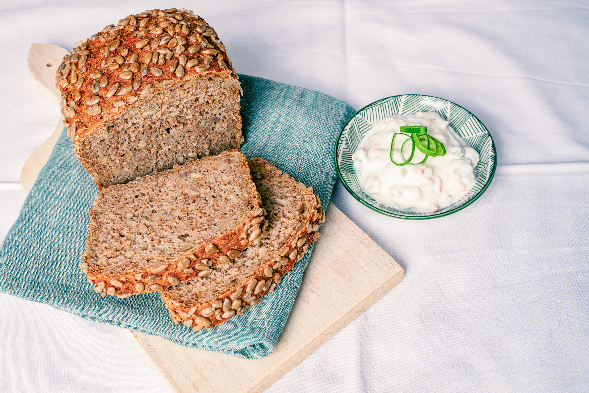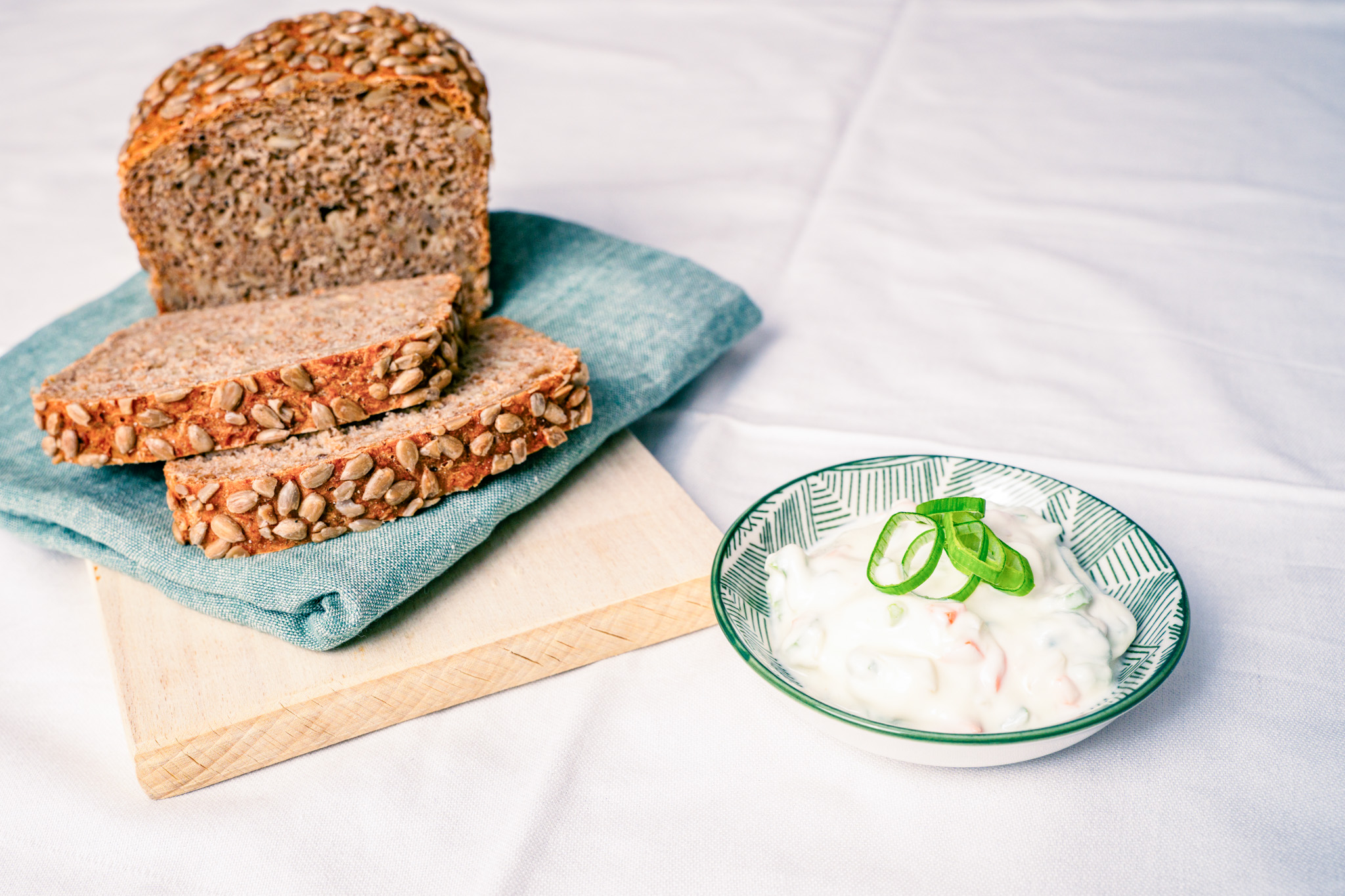 Der Frühlingsaufstrich passt sehr gut auf unserem Rohkost-Power-Brötchen.
