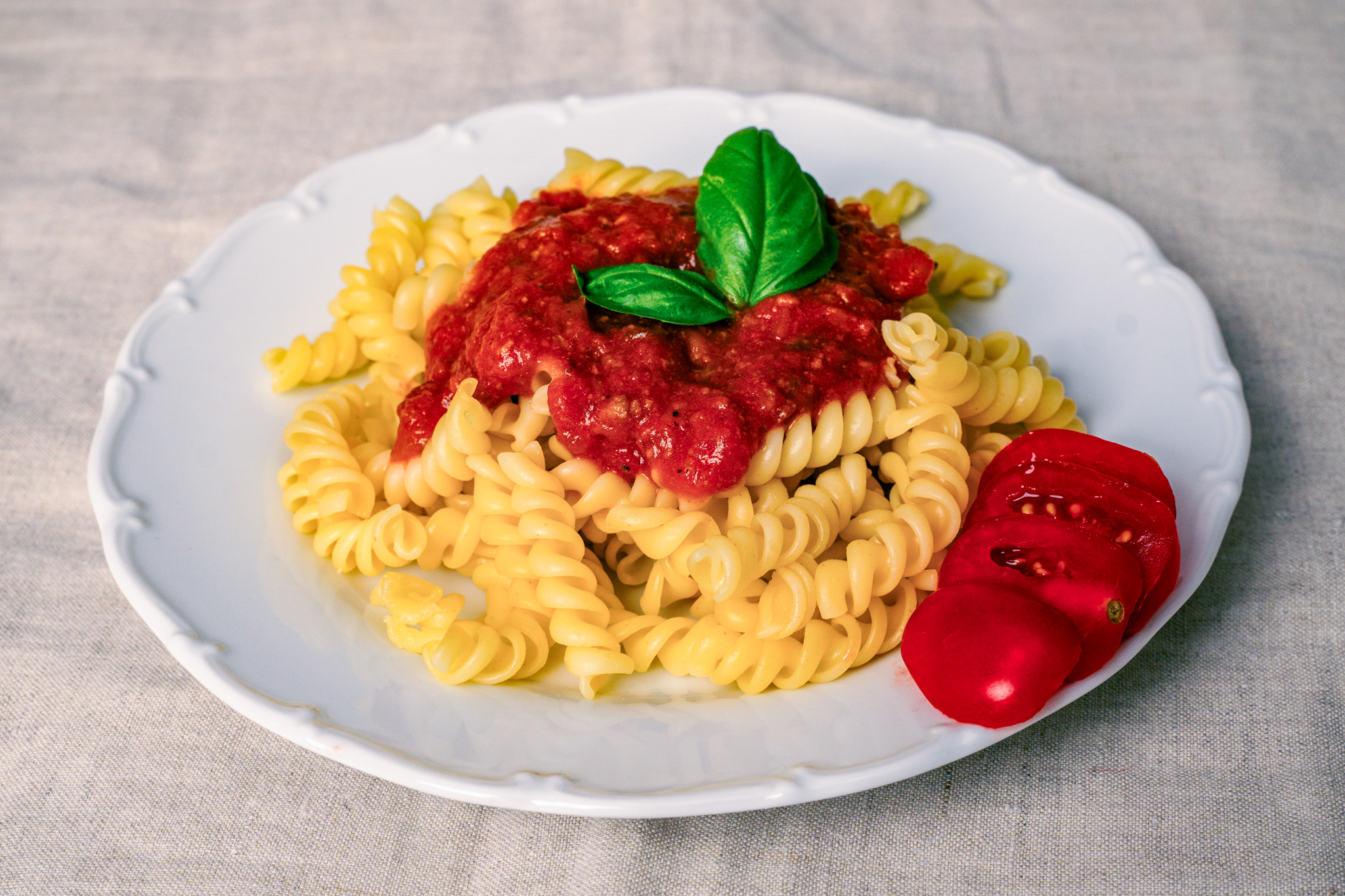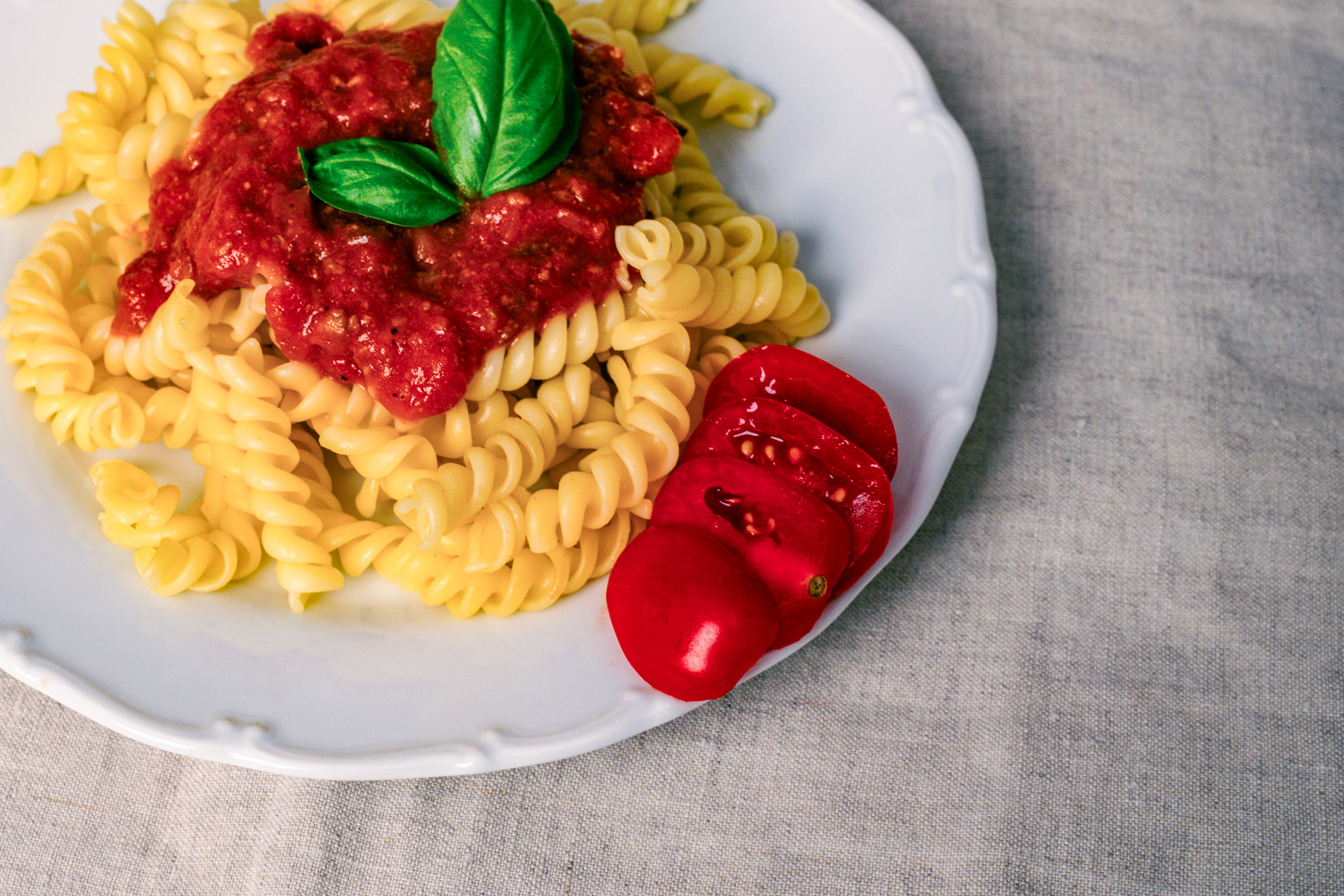 Für die Linsenbolognese die Linsen und die passierten Tomaten zufügen. Alles ca. 10-15 Minuten köcheln lassen, mit Pfeffer und Kräutern abschmecken.