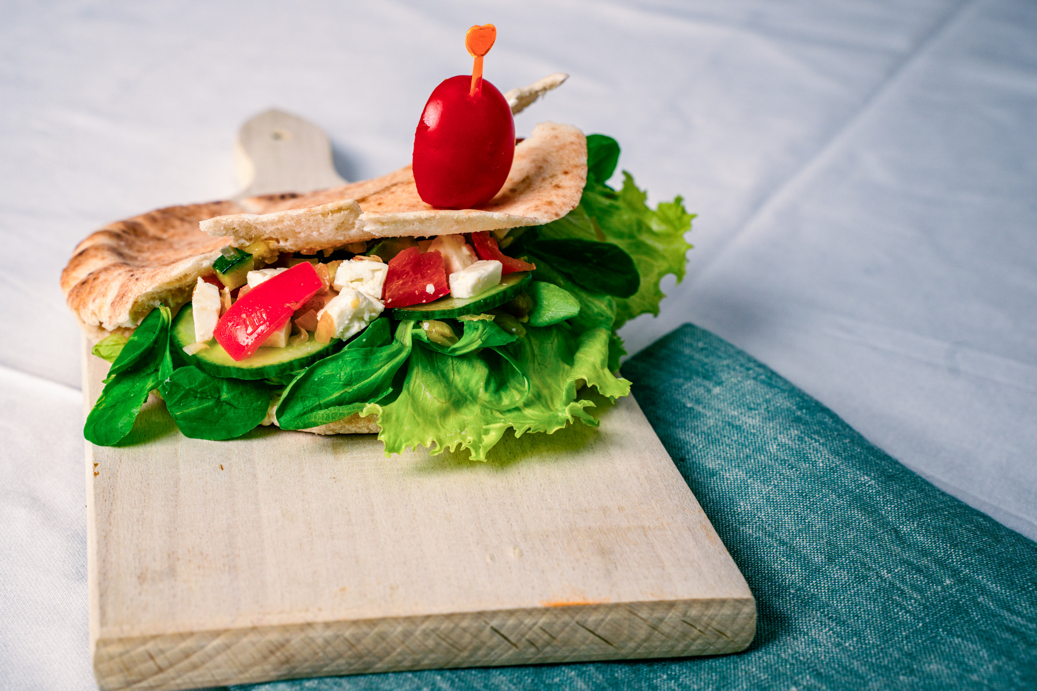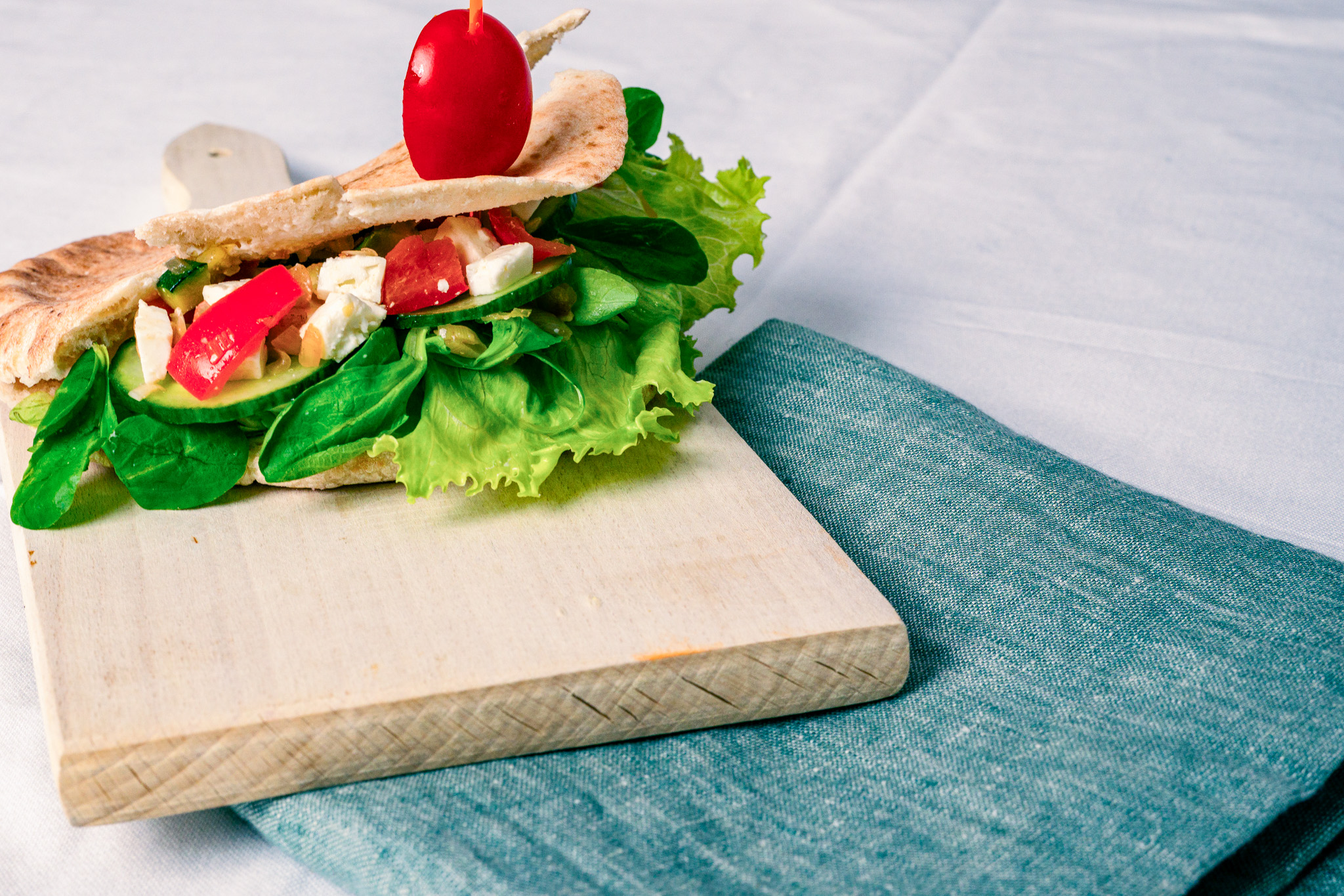 Die Brottasche mit dem Dip bestreichen und mit Salatblättern und Gurkenscheiben befüllen.