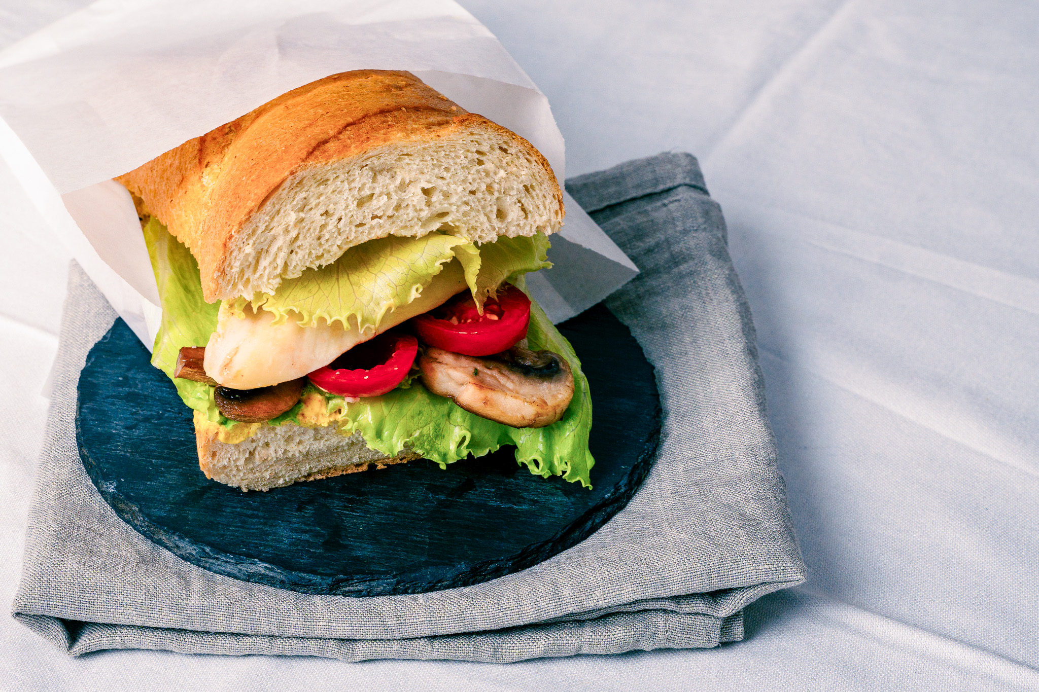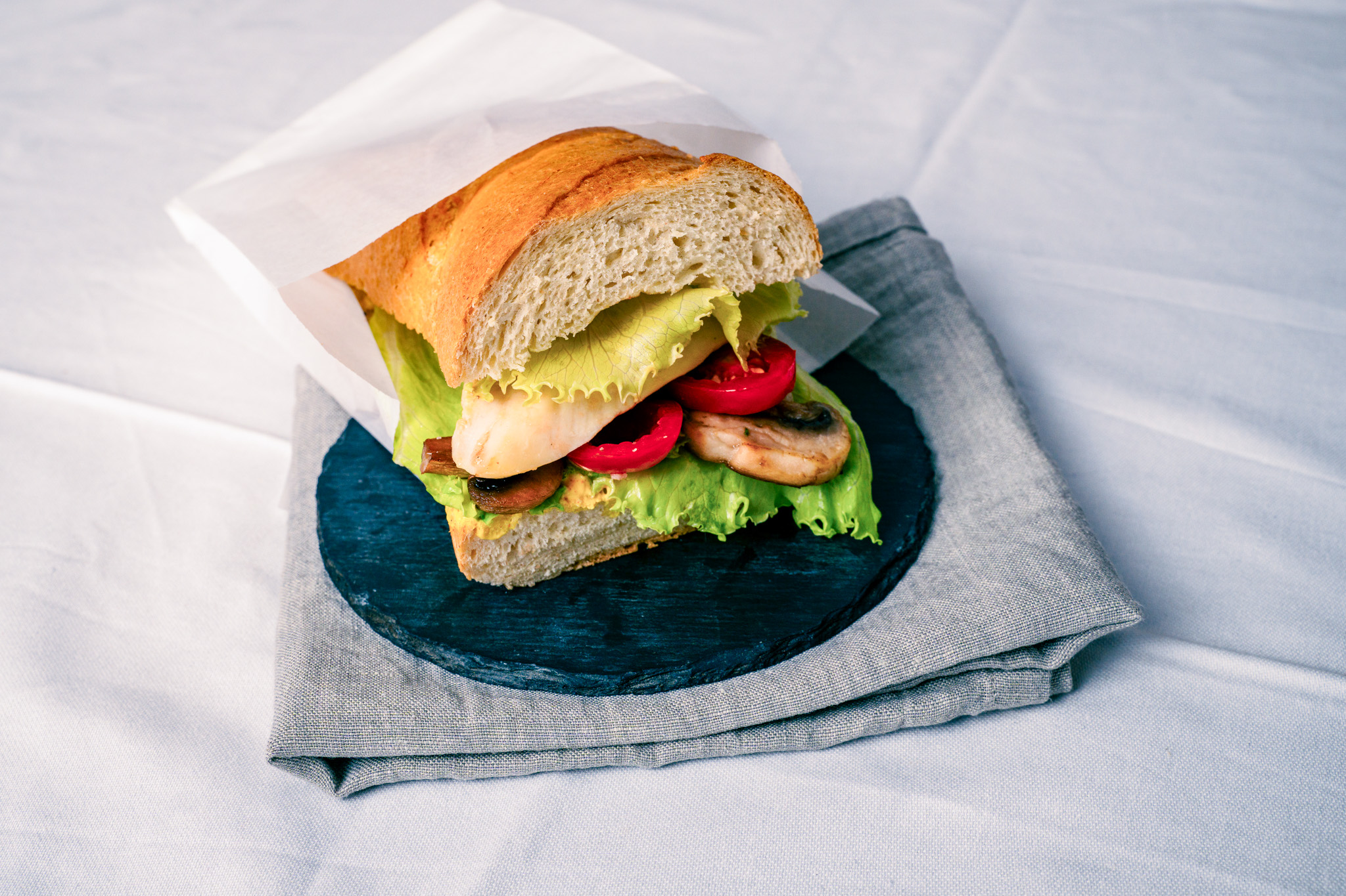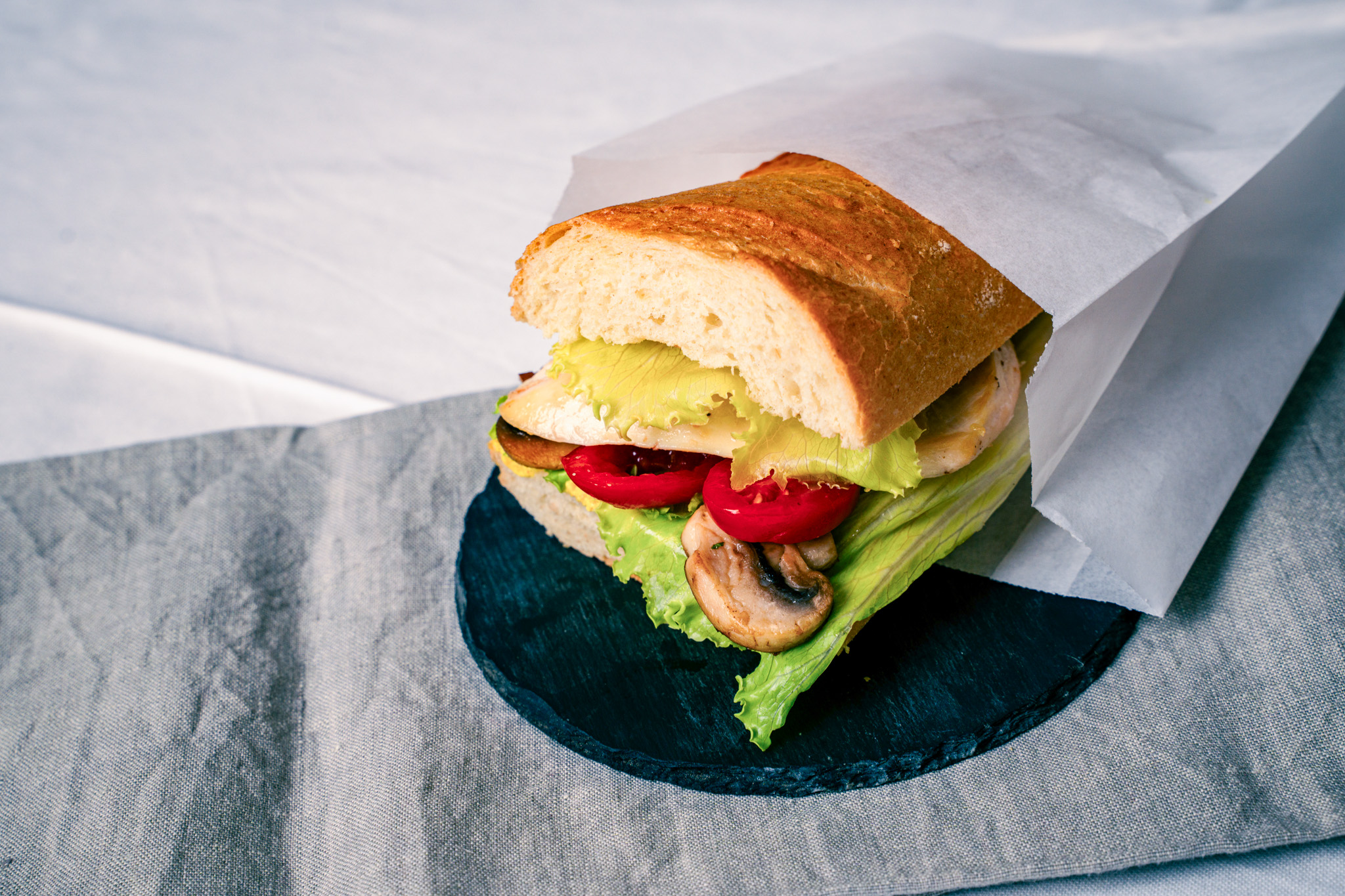 Ciabatta halbieren und mit Salat, Gemüse und gegrillter Hühnerbrust belegen.