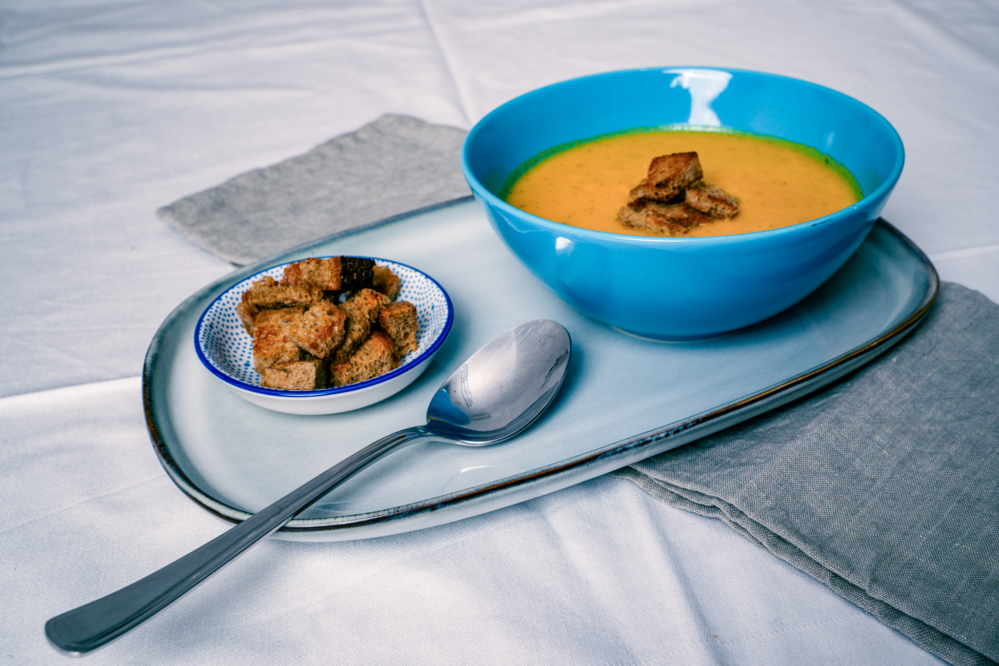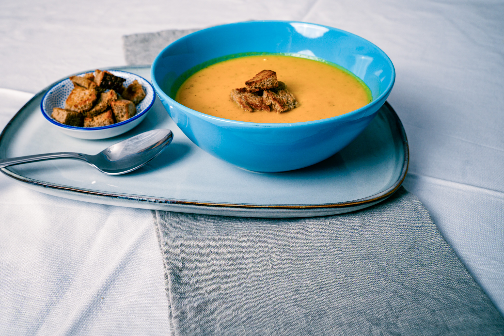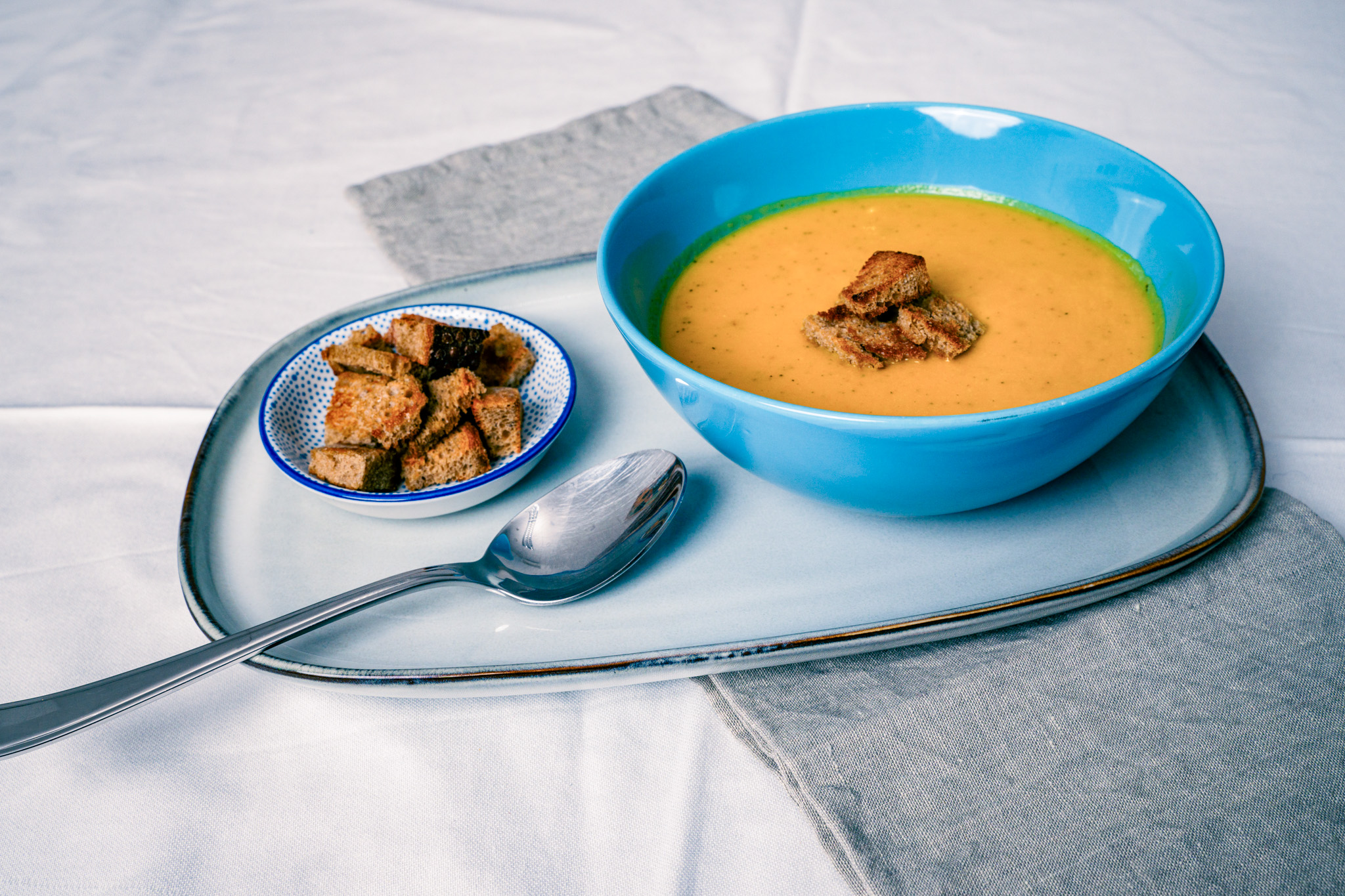 Für die Brot-Croutons das Brot in Würfel schneiden und in einer beschichteten Pfanne mit Rapsöl kurz anrösten. Mit der Suppe servieren.