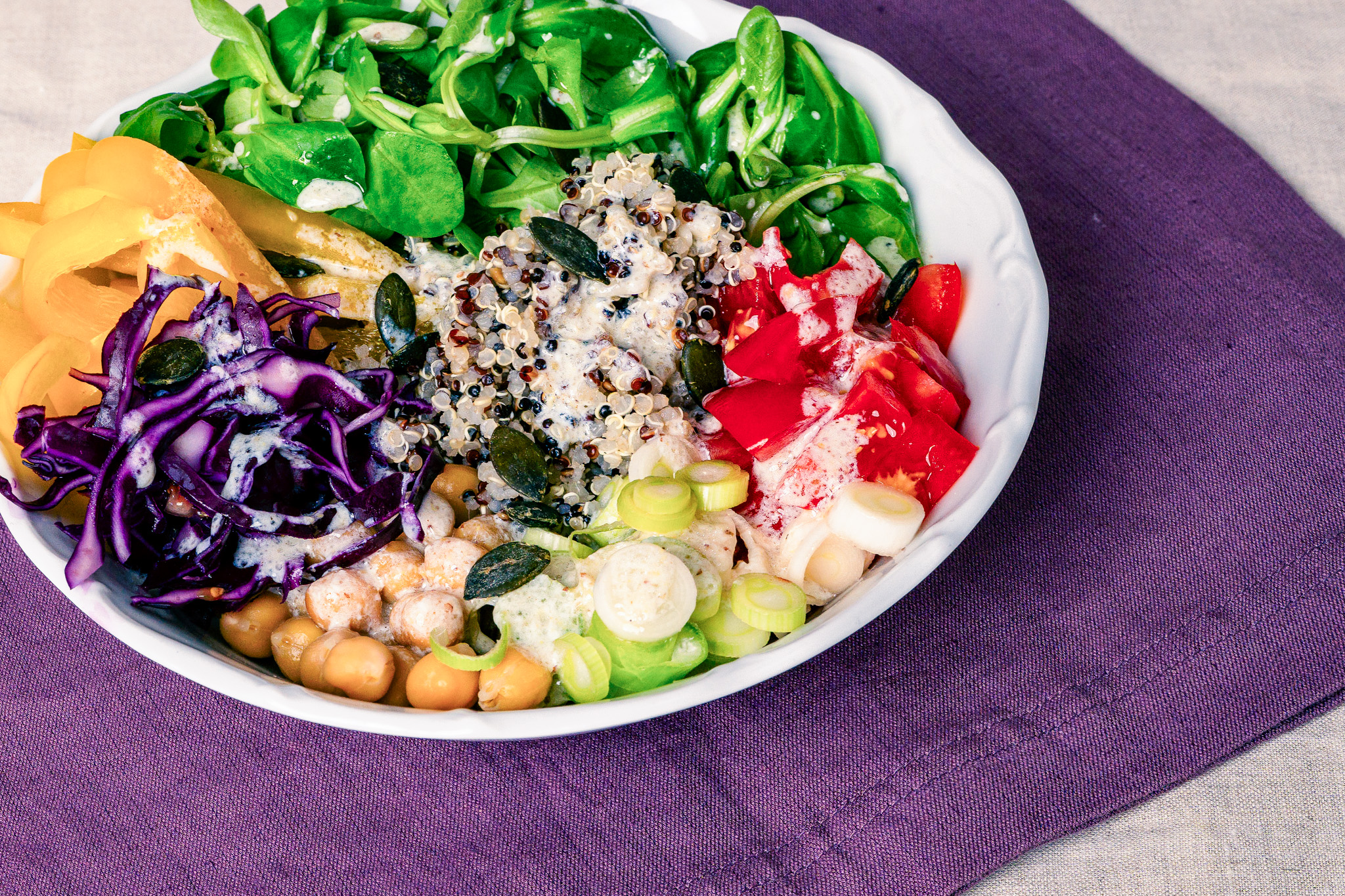 In einer Schüssel Quinoa, Gemüse, Salat und Kichererbsen verteilen. Das Dressing zugeben und alles mit Erdnüssen bestreuen.