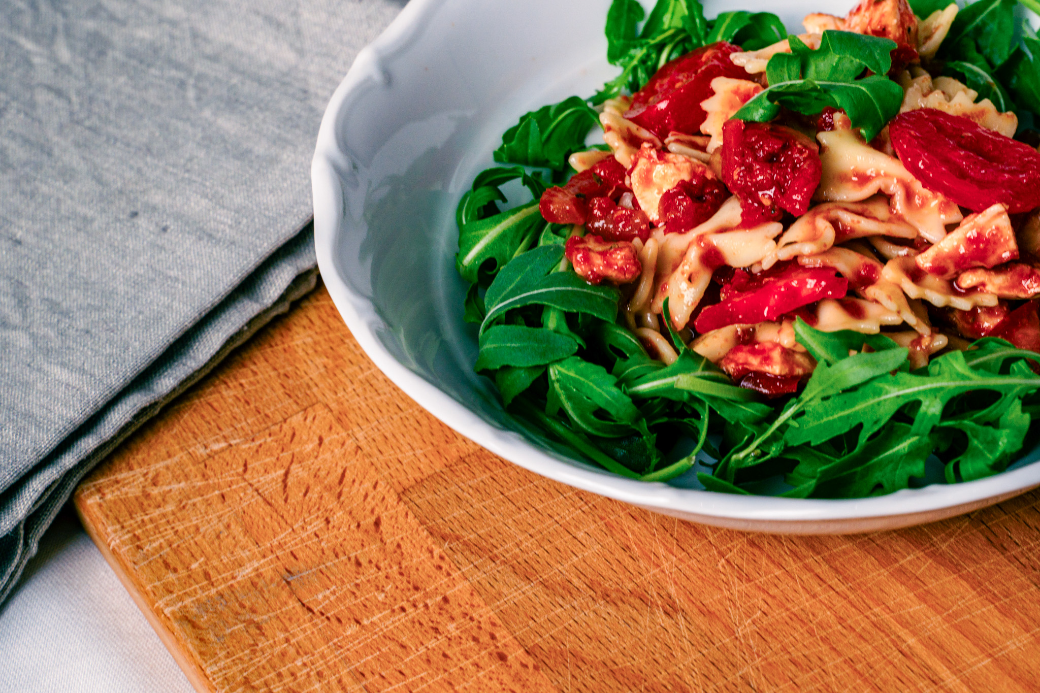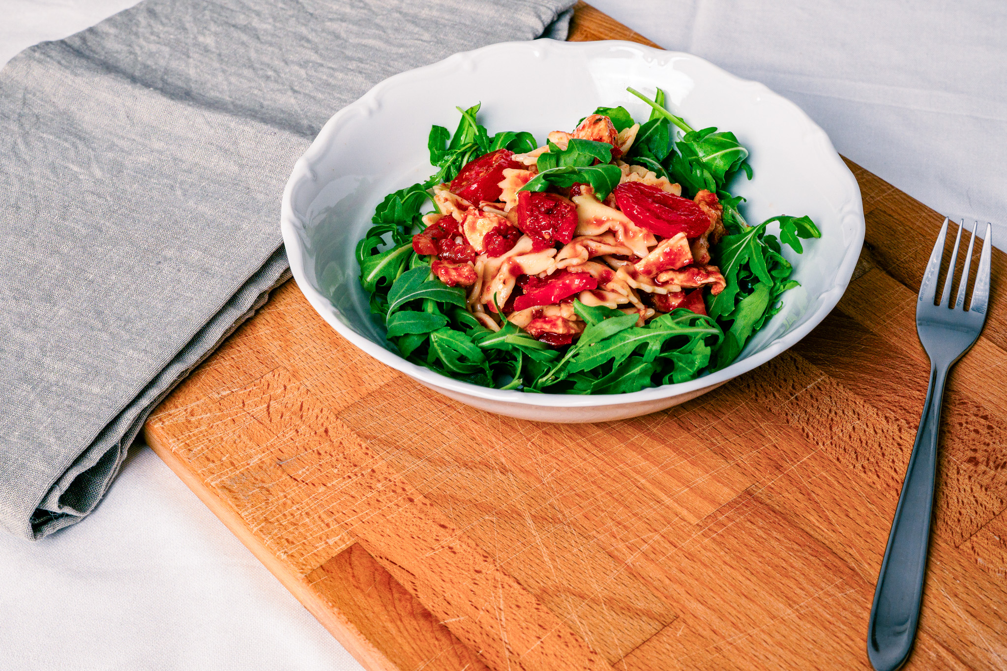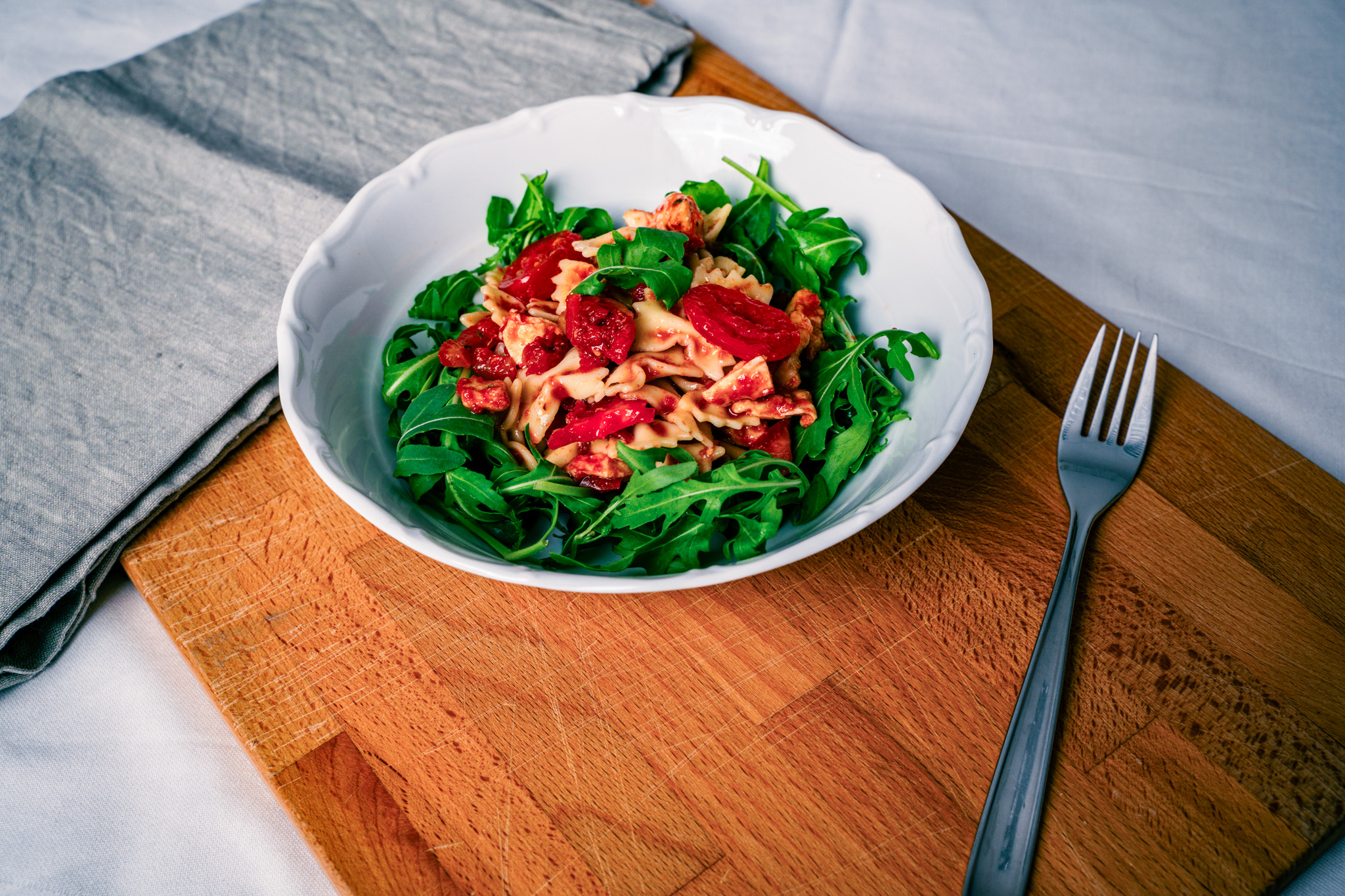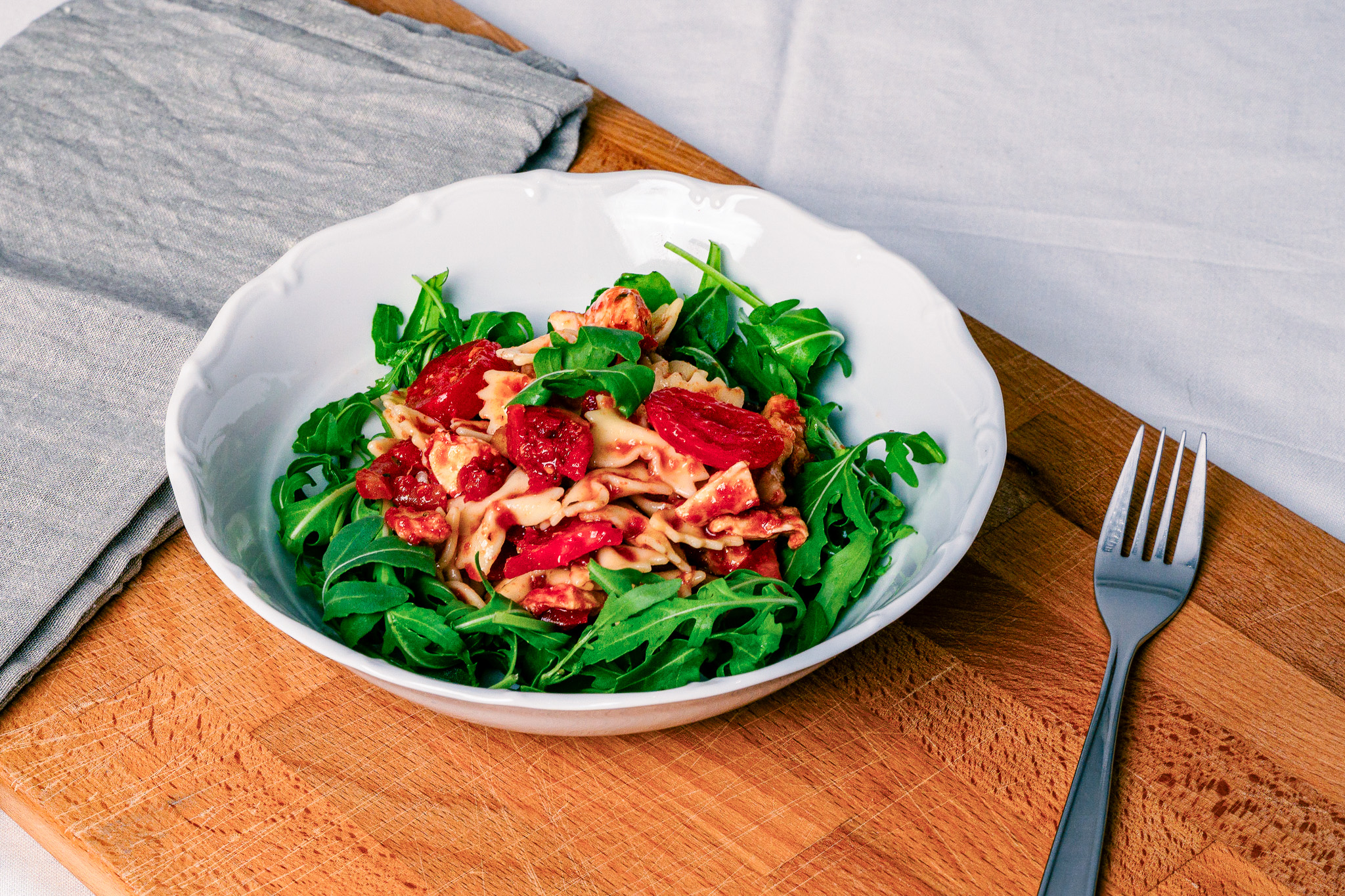Für das Dressing passierte Tomaten, Öl, Essig, Gewürze und Salz vermengen. Nudeln mit dem Dressing mischen, die Zutaten außer Rucola unterheben. Rucola in eine Schüssel geben und den Nudelsalat darauf verteilen.