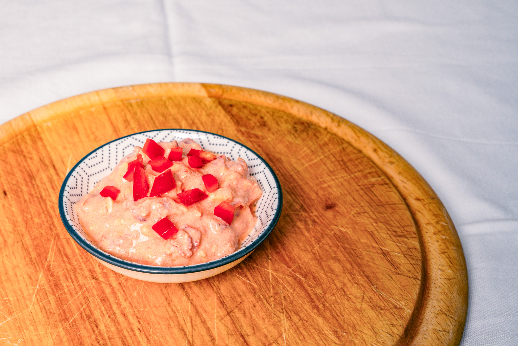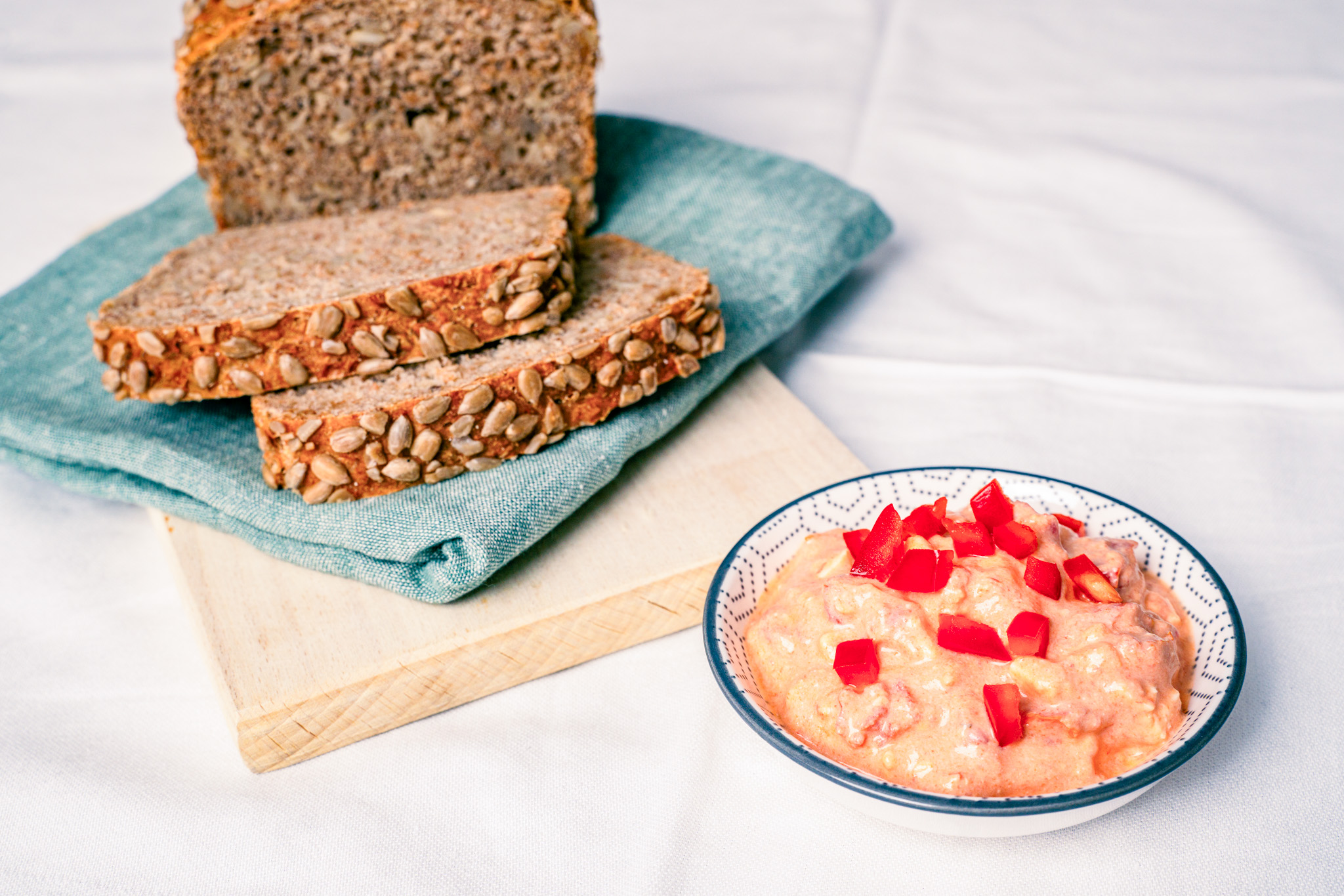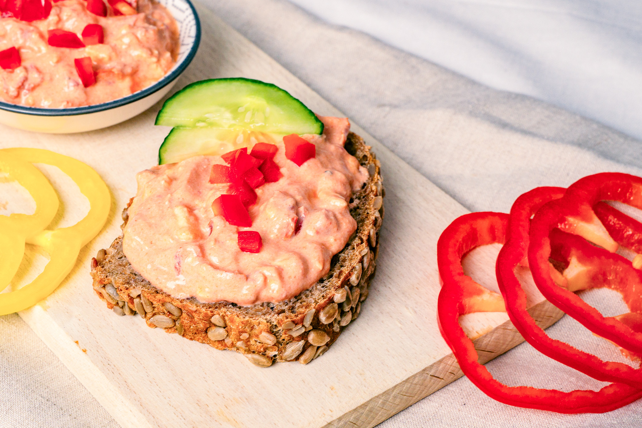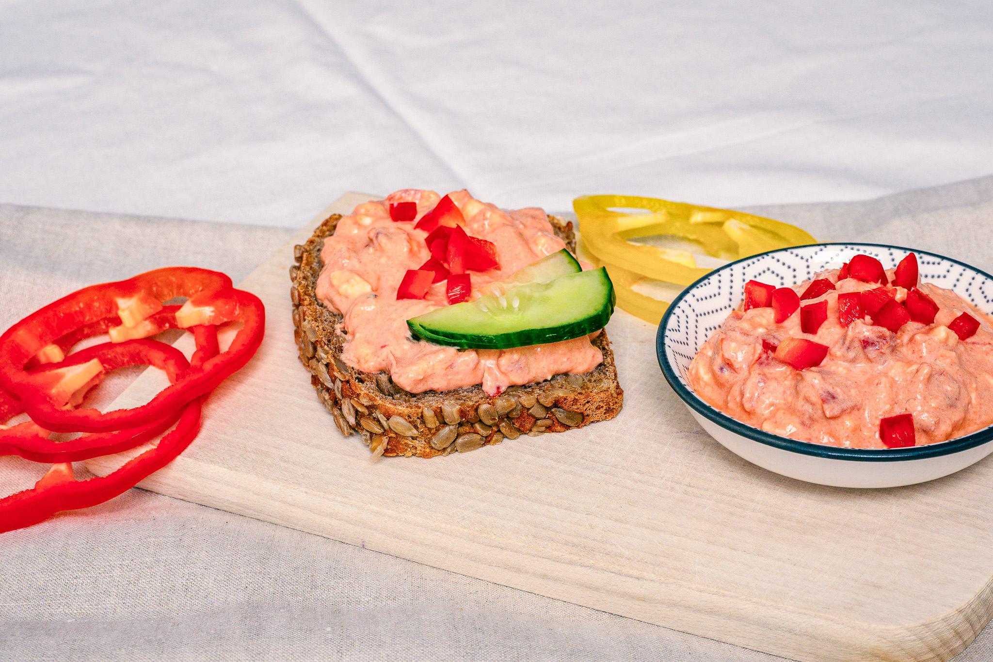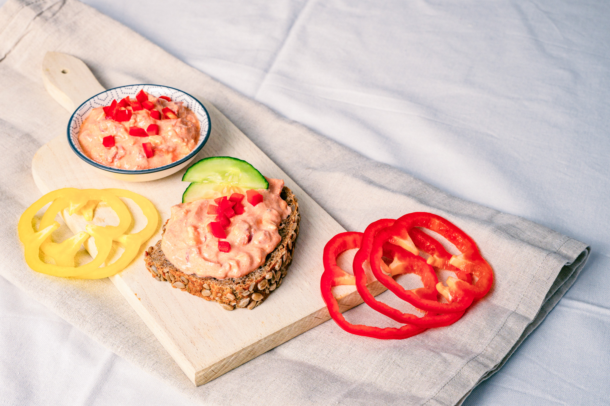 Tipp! Bieten Sie den Aufstrich als „All in Red“ an: Vollkornbrot mit Aufstrich bestreichen und reichlich mit Tomatenscheiben, roten Paprikastreifen und geraspelter Karotte belegen.