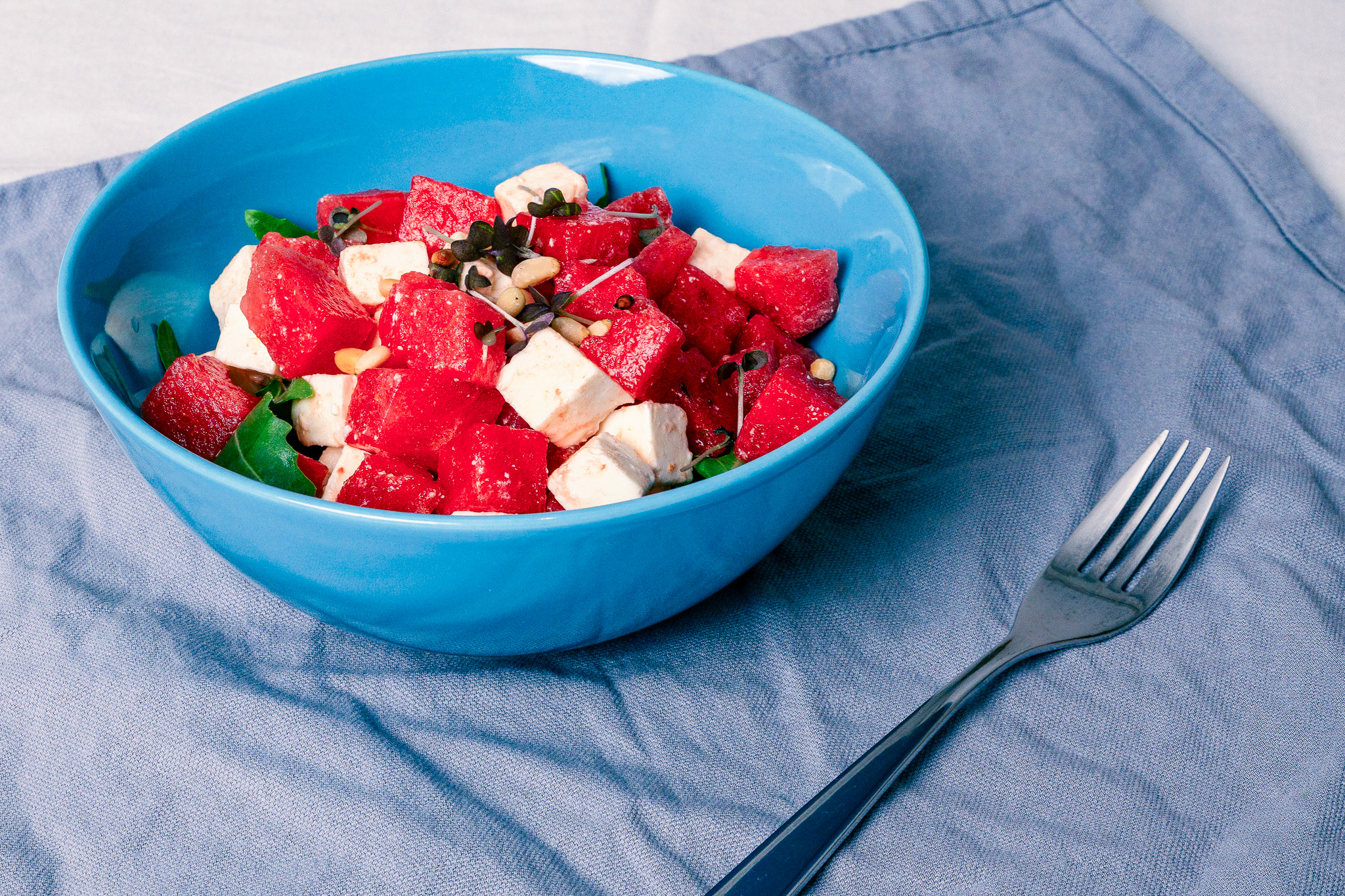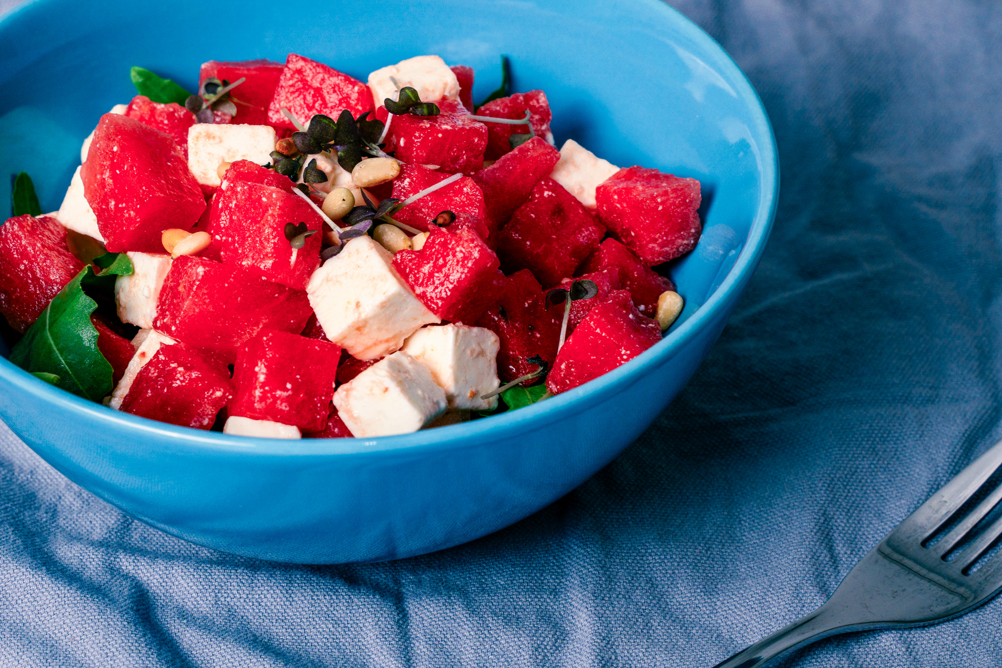 Wassermelone und Schafskäse in Stücke schneiden, gemeinsam mit dem Rucola in Schüsseln verteilen.